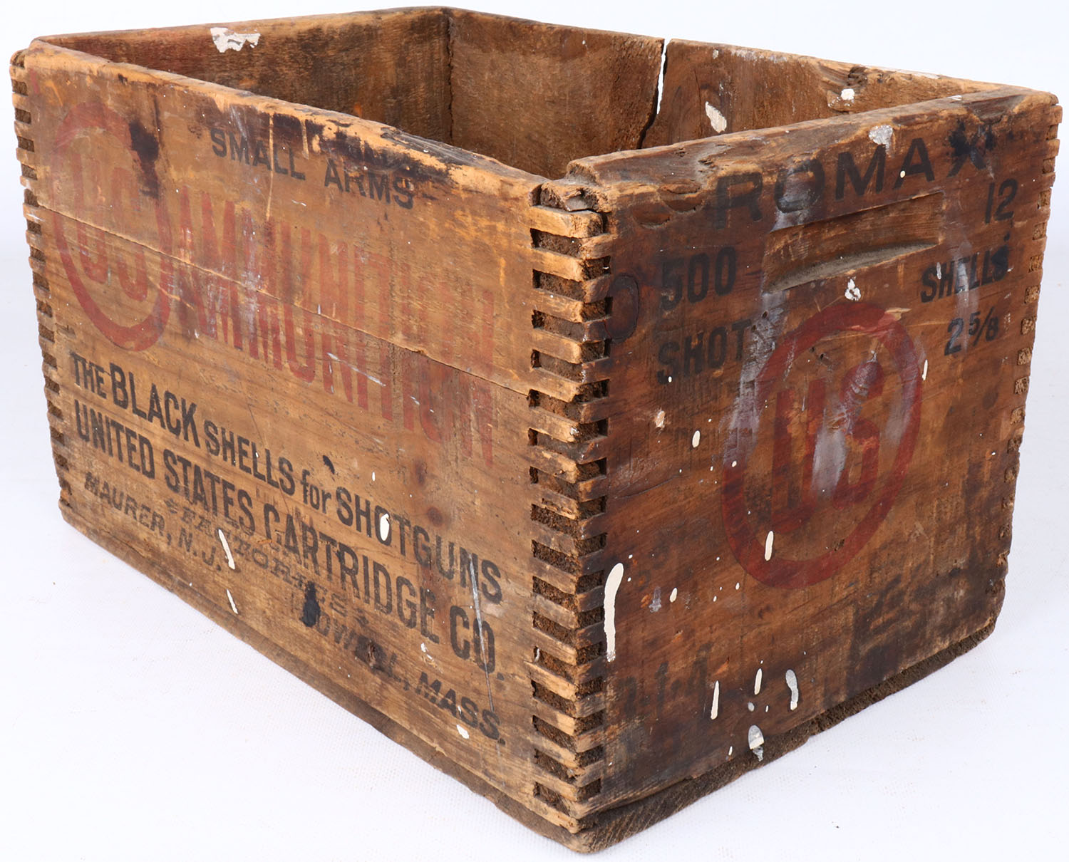 US Climax, The Black Shells, 12 ga., tongue and groove construction wood shipping crate, red & black print has some fading, has age soiling & dings, one side has 4'' crack, crate has some white paint splatter. Grade: Very Good - Value: 10 to 60