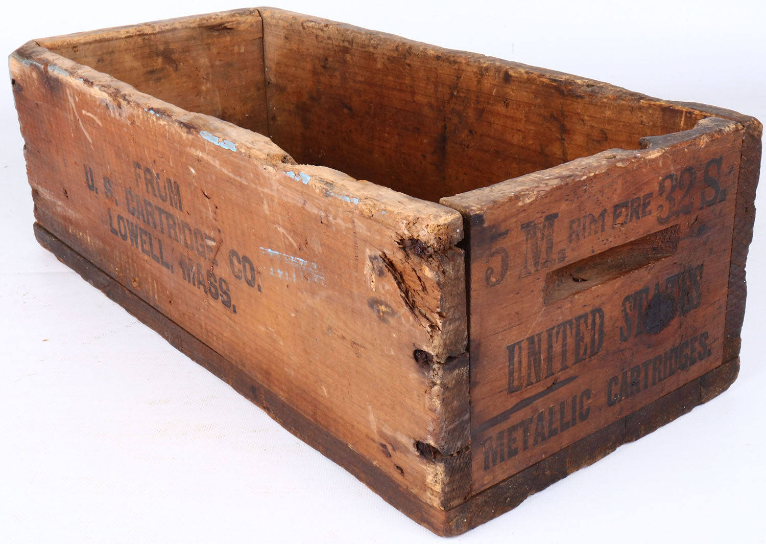 US, 32 S. nail construction wood shipping crate, black print has fading, crate has age soiling and minor dings. Grade: Very Good - Value: 10 to 50