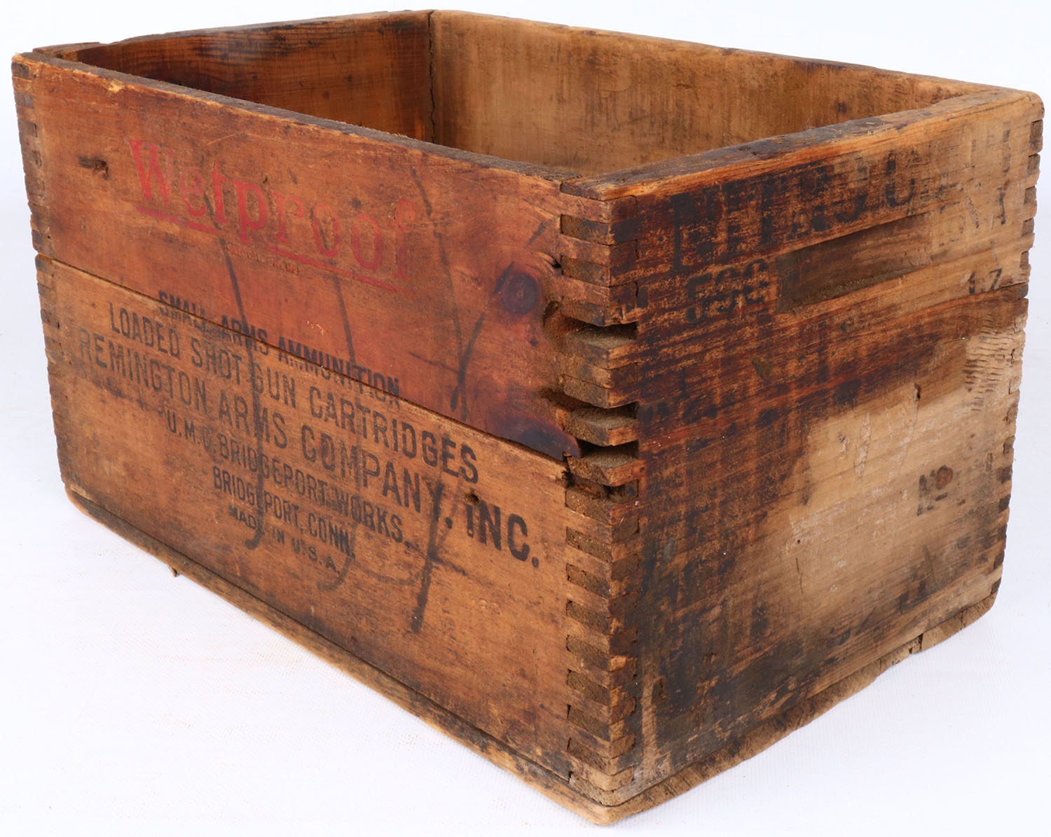 Remington UMC Nitro Club, 16 Ga., tongue and groove construction wood shipping crate, black & red print is solid on each side, but very faded on ends, crate has soiling but is solid. Grade: Very Good - Value: 10 to 60