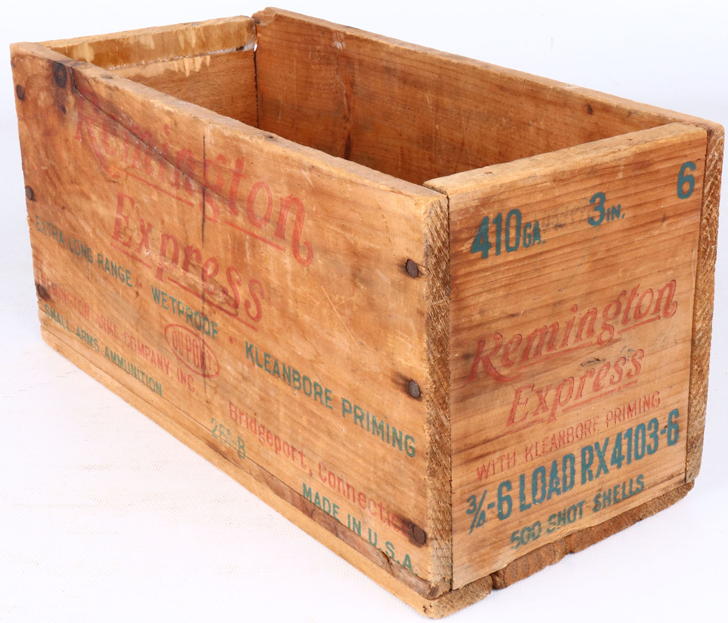 Remington Express, 410 Ga., 6 shot, nail construction, green print is solid but red print has fading, crate is solid with minor dings. Grade: Very Good ++ - Value: 10 to 40