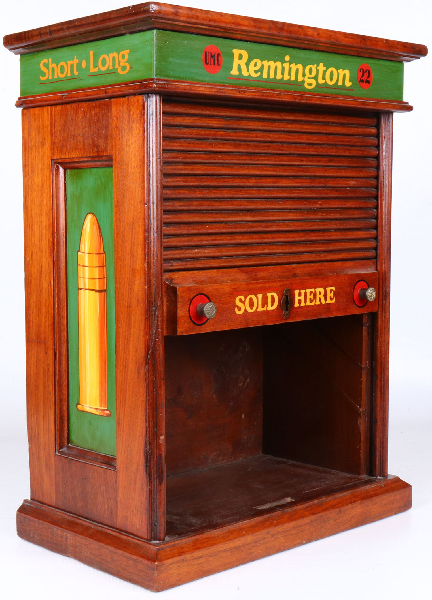 Remington 22 dealer display case, 22'' x 16 1/2'' x 9 1/2'', appears to be refurbished & renewed, has inlet inside for 1 shelf, sliding door functions properly, minor dings, paint is mint. Grade: Excellent ++ - Value: 20 to 500