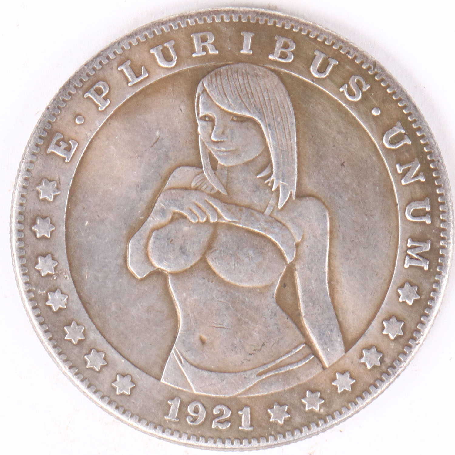 RARE Brothel / Saloon Token coin silver. Same size as original silver dollar with nudie on back side. All markings exactly as an original silver dollar. Dated 1921. Grade: Very Good ++ - Value: 50 to 400
