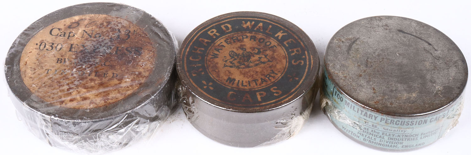 Lot 3 5 percussion caps tins, all Partial, has some age soiling. Grade: Very Good ++ - Value: 6 to 40