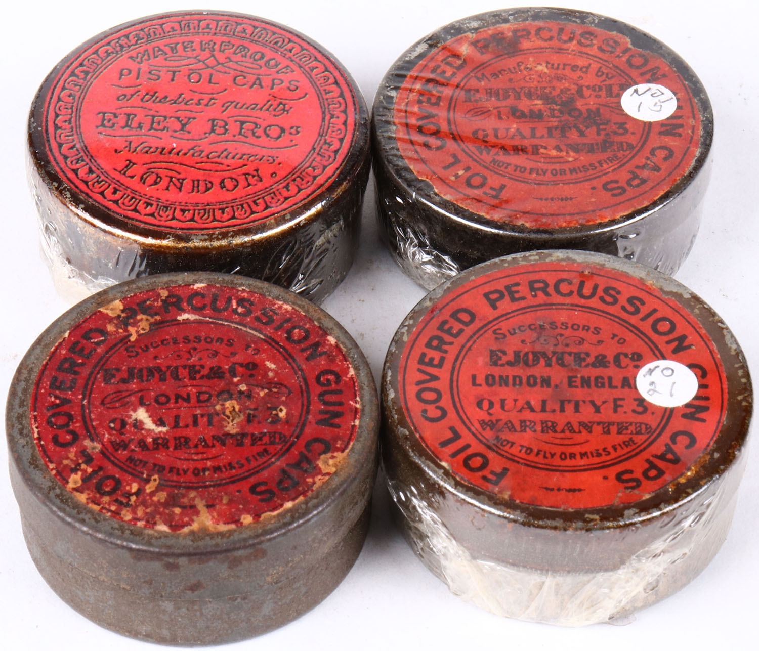Lot of 5 percussion caps tins, all Partial, has some age soiling. Grade: Very Good ++ - Value: 10 to 50