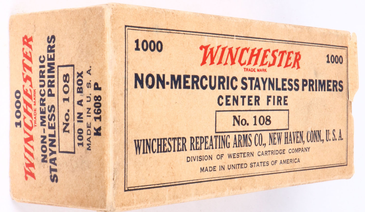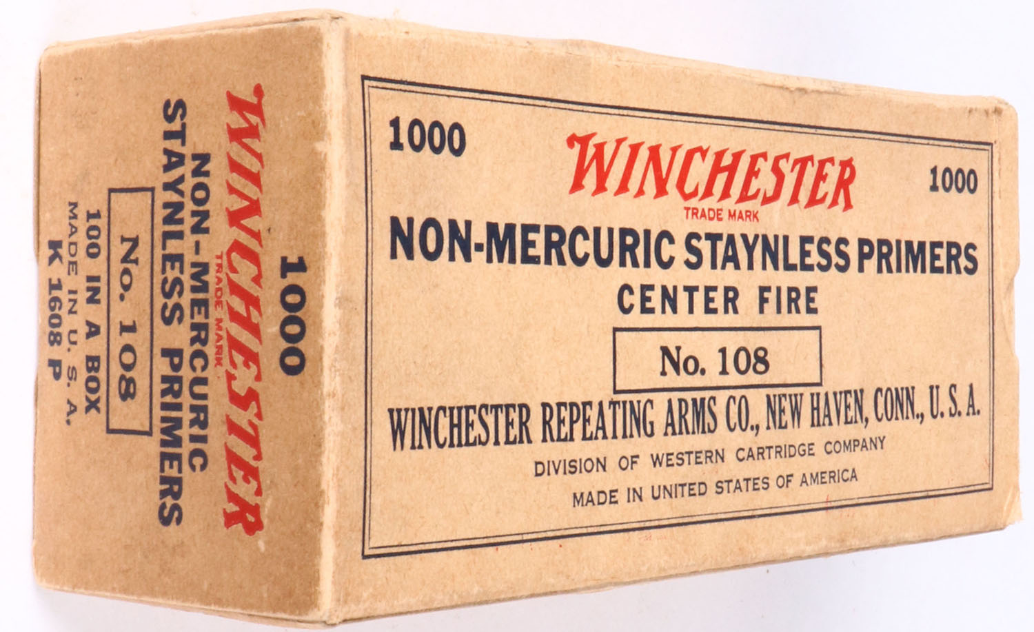 Winchester primer brick, FULL, No 108 primers, inside primer boxes all bright and clean, brick has weak end flaps. Grade: Excellent - Value: 30 to 100