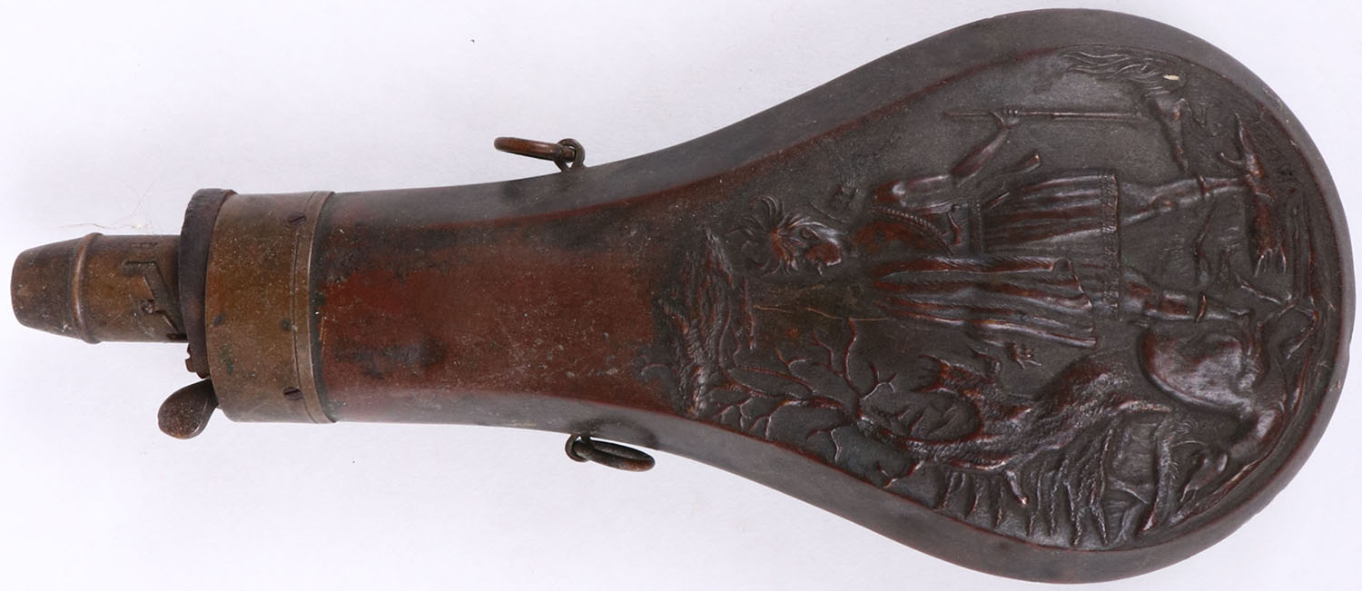 Brass powder flask, beautiful design, age soiling. Grade: Very Good - Value: 10 to 50