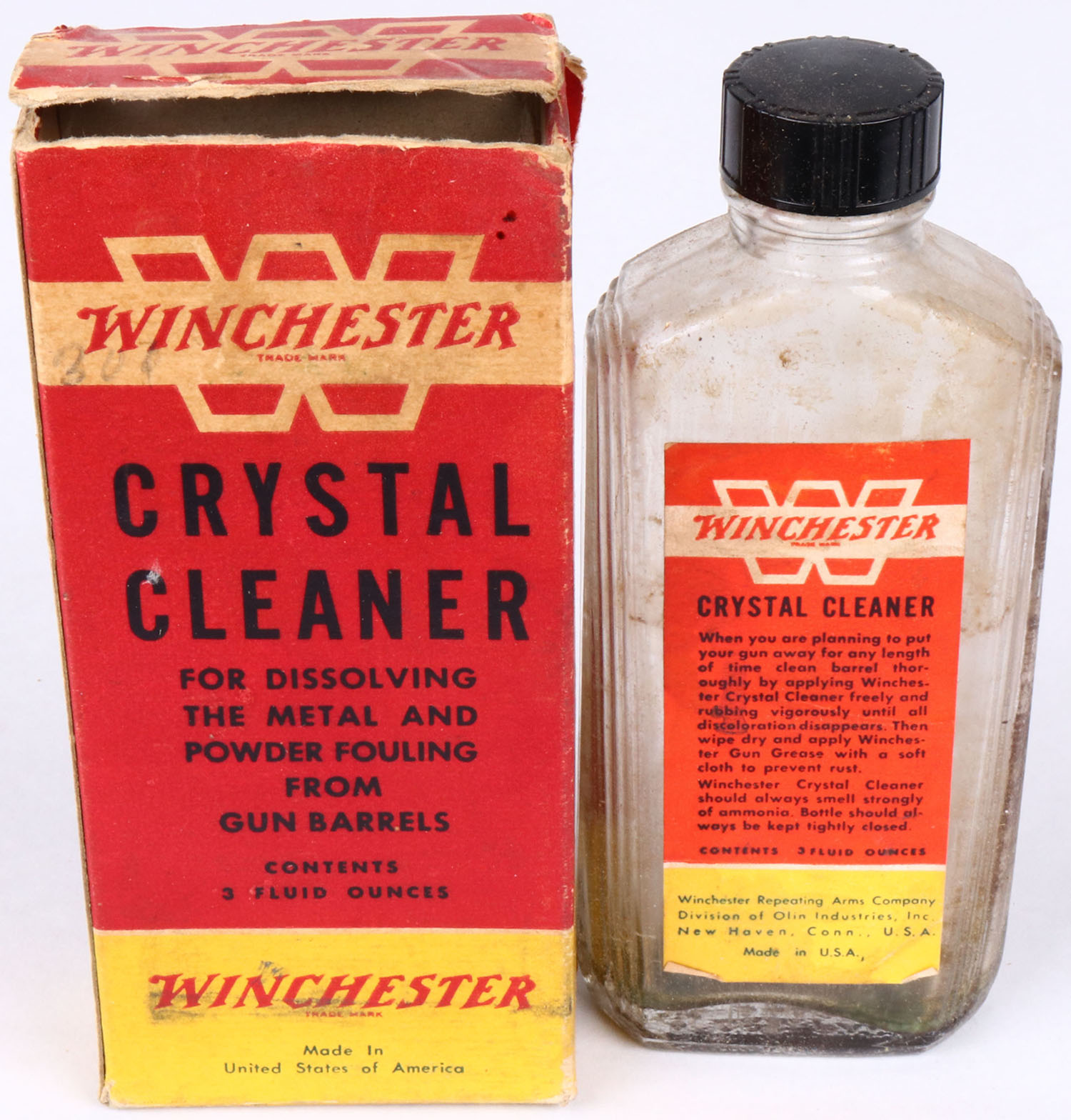 Winchester crystal cleaner glass jar with original box,, Empty, plastic cap, box has age soiling and jar is solid. Grade: Very Good ++ - Value: 10 to 60
