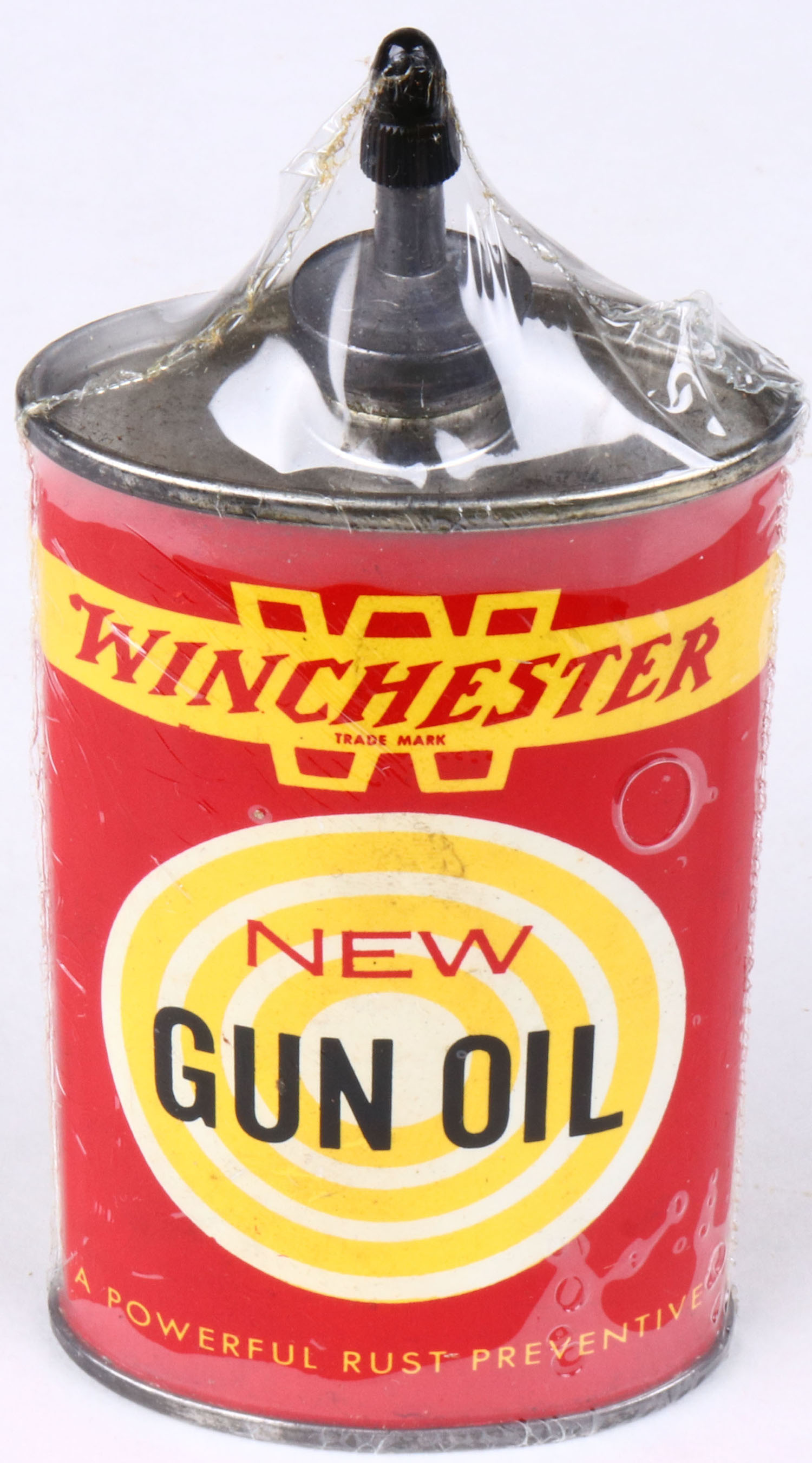 Winchester Oil Tin, New Gun Oil, lead spout & plastic cap, partial, very bright and clean. Grade: Excellent - Value: 6 to 60