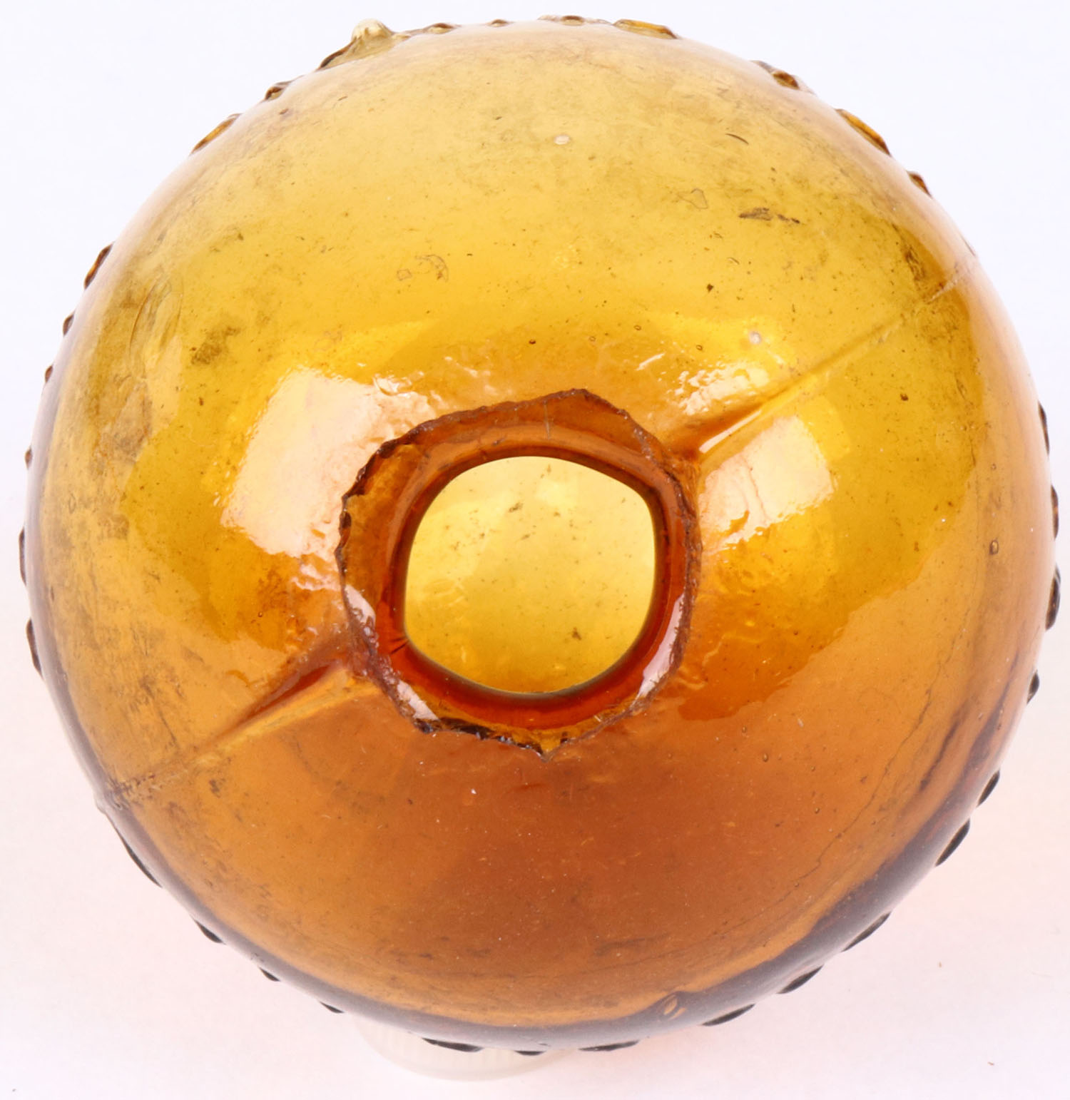 RARE! Amber Glass Target Ball, smooth pattern, 3 pieces,, ''IRA Paine's Filled Ball PAT. OCT.23 1877'', 2 5/8'' dia., low neck, circa 1880-1900. Grade: Excellent ++ - Value: 100 to 500