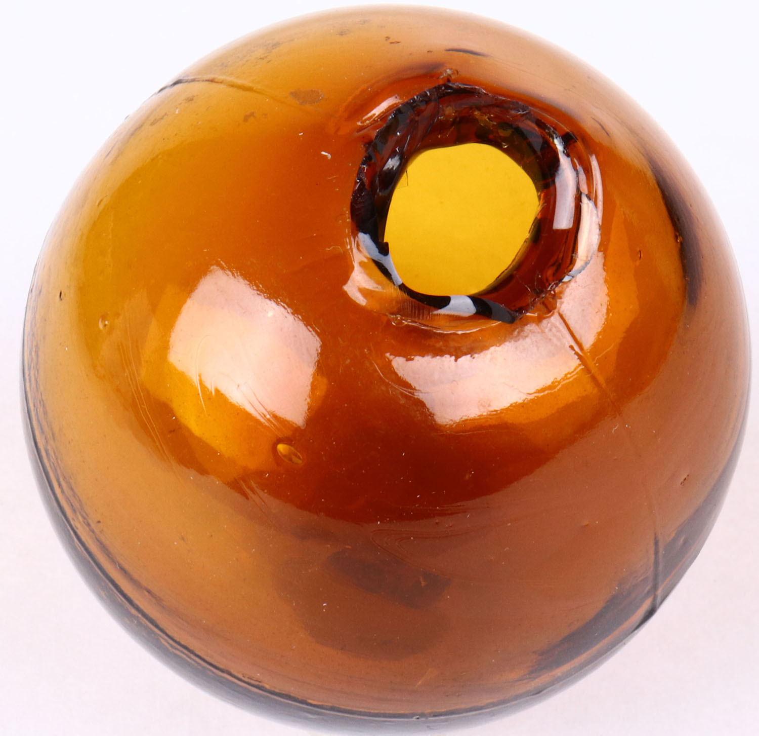 RARE! Medium amber Glass Target Ball, 3 piece mold, 2 5/8'' dia., low neck, circa 1880-1900. Grade: Excellent ++ - Value: 300 to 600