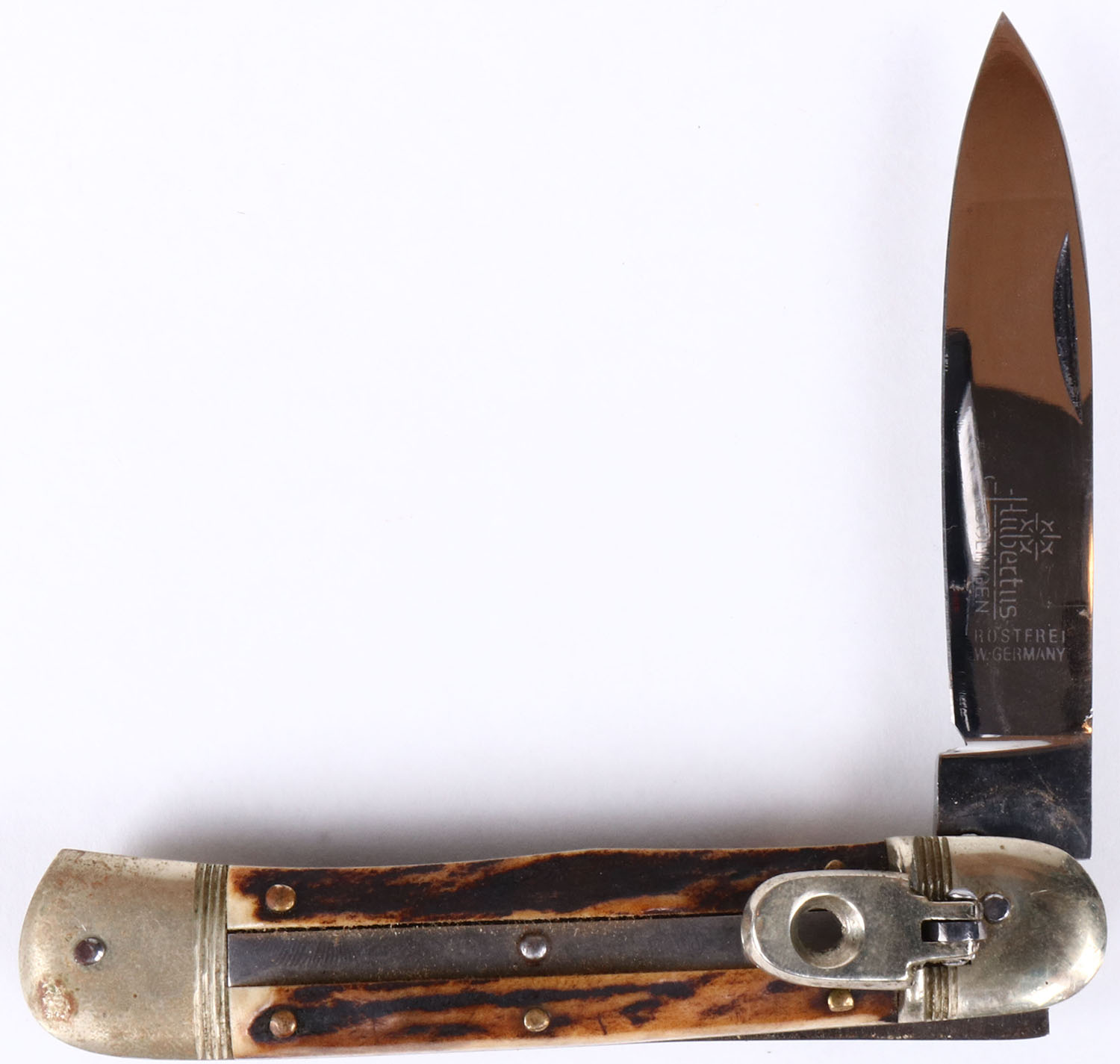 Folding knife marked ''Hubertus Solingen'', 3 1/2'' blade, stag handle, blade has as quick release button, blade is bright and clean, handle has some rust. Grade: Very Good ++ - Value: 100 to 400