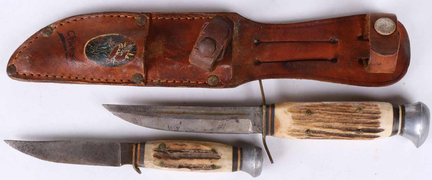 Knife set, stag handle, with leather sheath, all have age soiling. Grade: Very Good ++ - Value: 20 to 100