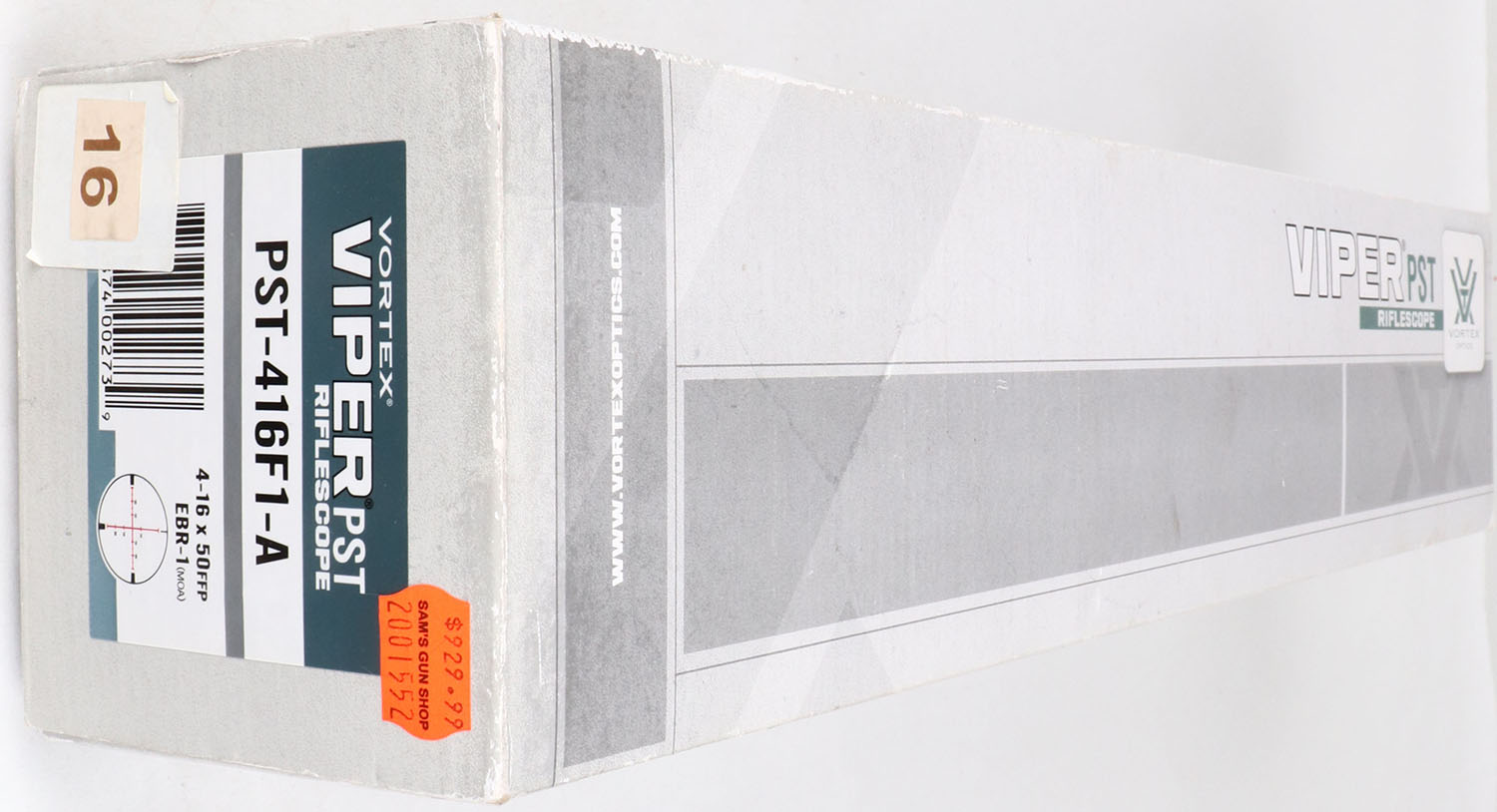 Viper, PST, 4-16 x 50mm Variable Magnification Rifle Scope, NIB, 30mm Tube Diameter, First Focal Plane EBR-1 (MOA) Illuminated Reticle, Adjustable Parallax from 50 Yards to Infinity, Fast Focus Eyepiece, Nitrogen Gas Purged Housing, Waterproof, Fogproof, Shock Proof, 4 Inches of eye relief, 13.7 Inches long, weighs 22.4 Ounces, Medium Height exposed locking turrets have 75 MOA of internal adjustment for elevation and windage, 1/4 MOA Clicks, very tight and positive and audible clicks with virtually no play between clicks, Fully Multi-Coated Glass is outstanding, comes with RZR Zero Stop, Sun Shade, Cleaning Cloth, CR2032 Battery, and the unmatched Vortex VIP Unconditional Warranty. Grade: MINT - Value: 400 to 1200