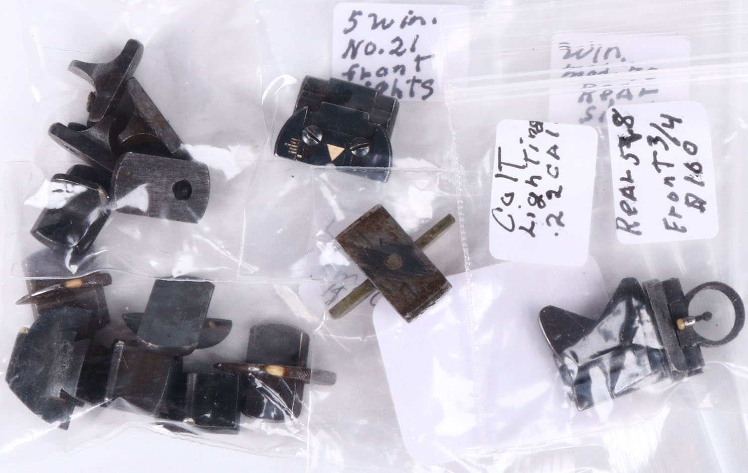 Lot of 5 Win no. 21 front sights, a Rocky Mountain blade front sight, a folding leaf & front globe sights off a colt lightning 22, a Win mod 70 folding leaf rear & 6 additional front blade sights large & small, some with ivory bead. Grade: Excellent - Value: 200 to 500