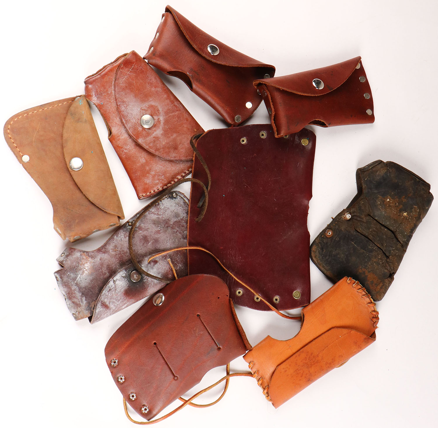 Large lot of leather axe head covers. Grade: Very Good ++ - Value: 10 to 200