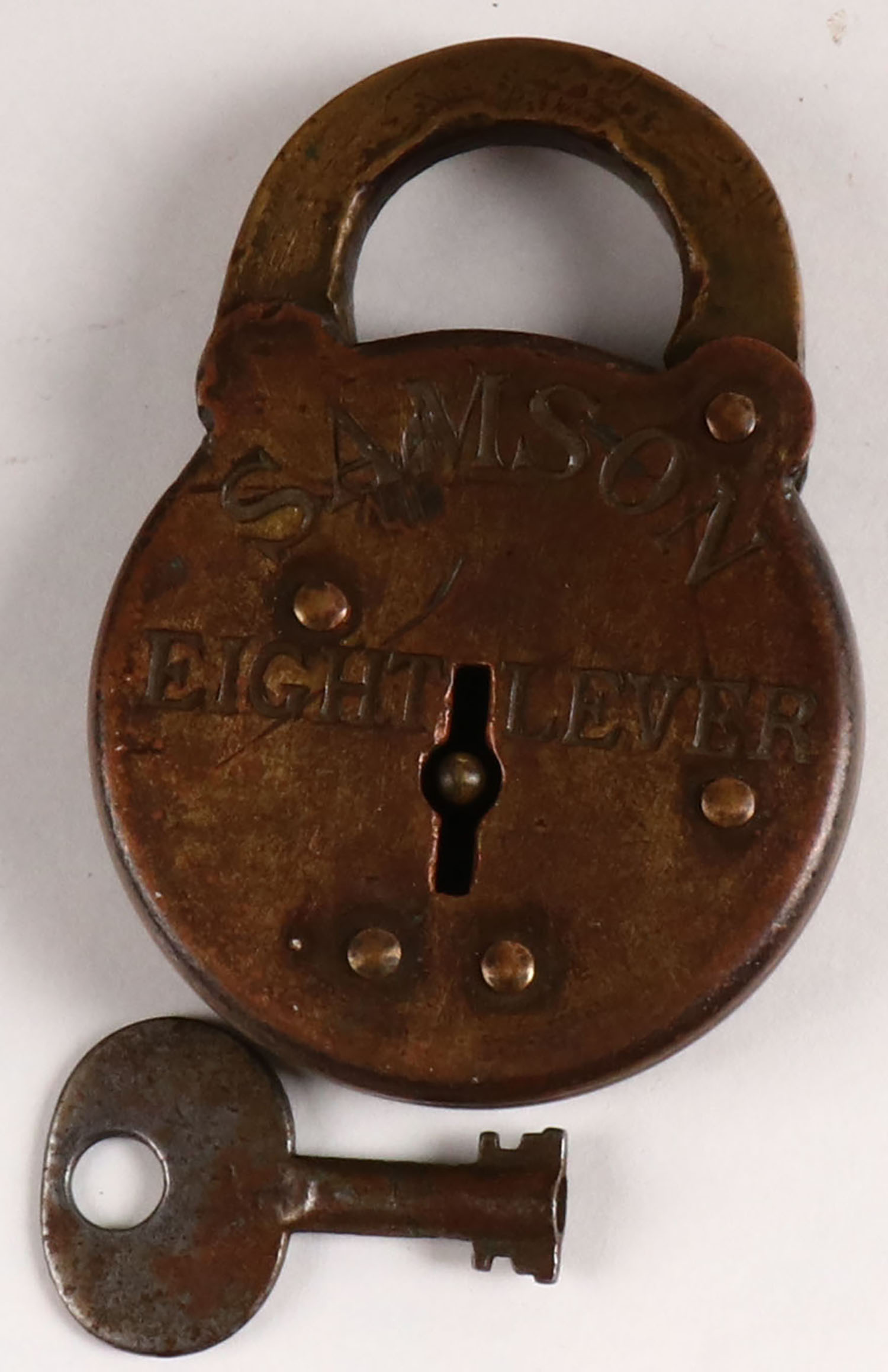 Samson brass padlock, 1 key, has rust. Grade: Very Good - Value: 2 to 40