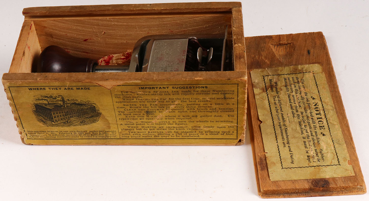 The Roberts Model 49 Automatic Numbering Machine, in orignal wood box, #457399, has labels on all sides other than the bottom, solid and still functions. Grade: Very Good + - Value: 10 to 100