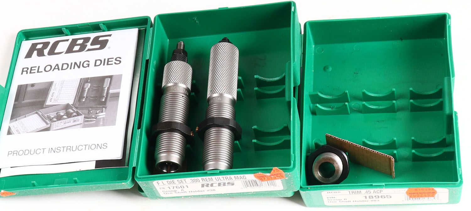 Lot of 2 RCBS reloading dies, ..300 Rem Ultra Mag and Trim .45 acp., in original box. Grade: Excellent - Value: 16 to 60