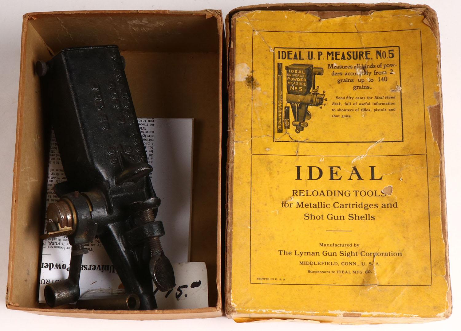 Ideal powder measurer, in orignal box. Has age soiling. Grade: Very Good ++ - Value: 10 to 100