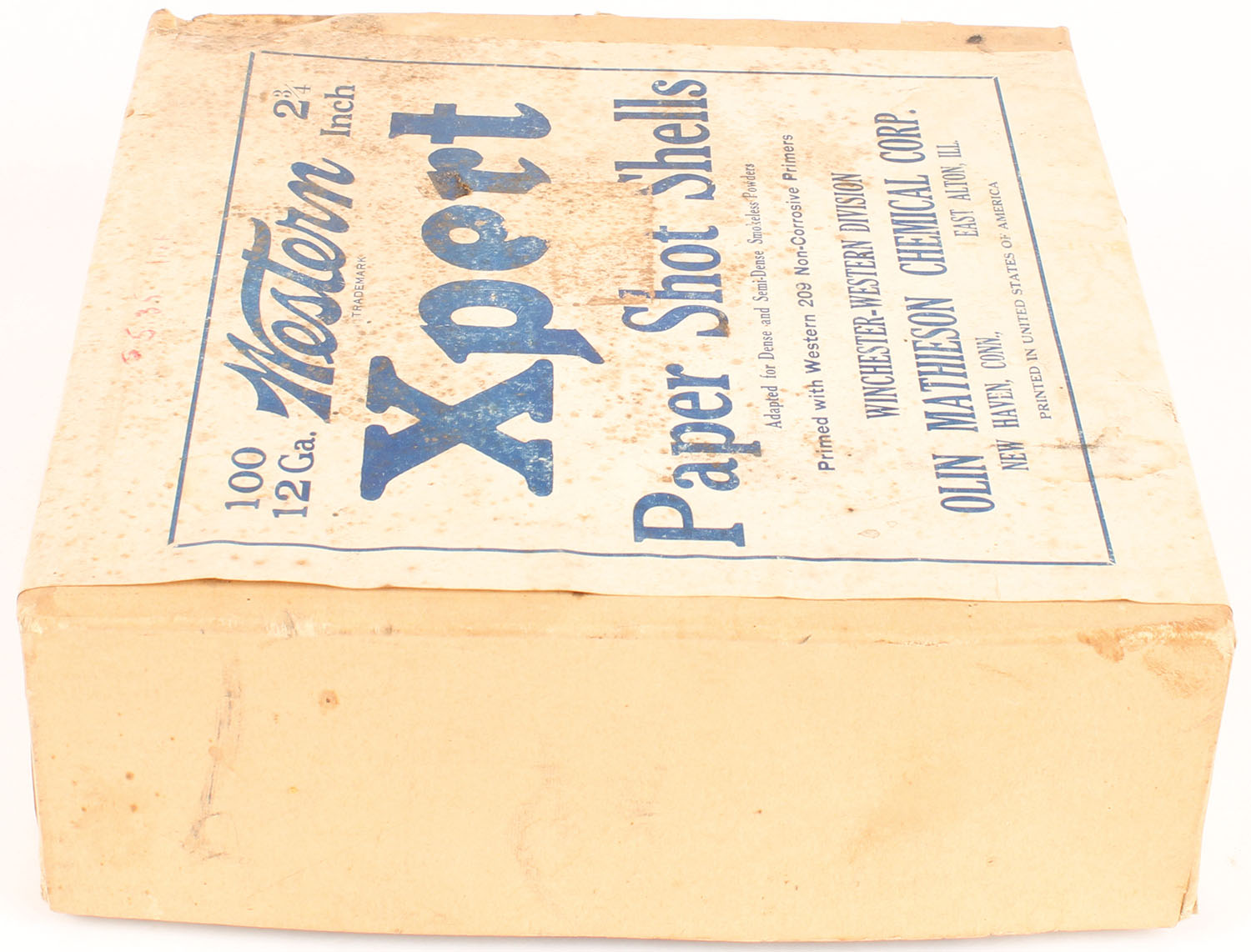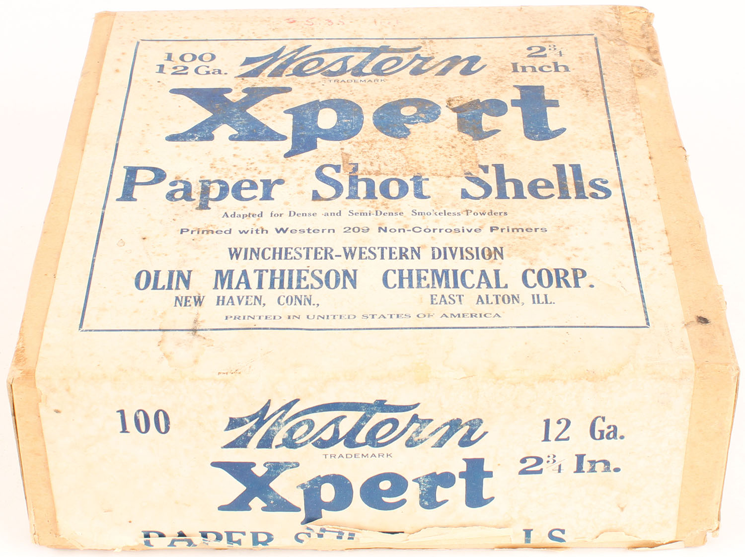 Western, XPERT, 12ga., 2pc., Partial 84%, buff box with white & blue label, 2 3/4 Inch, 100 count, paper shot shells, box & label are very solid, box has soiling with small puncture on top, Shells are excellent. Grade: Very Good ++ - Value: 50 to 100