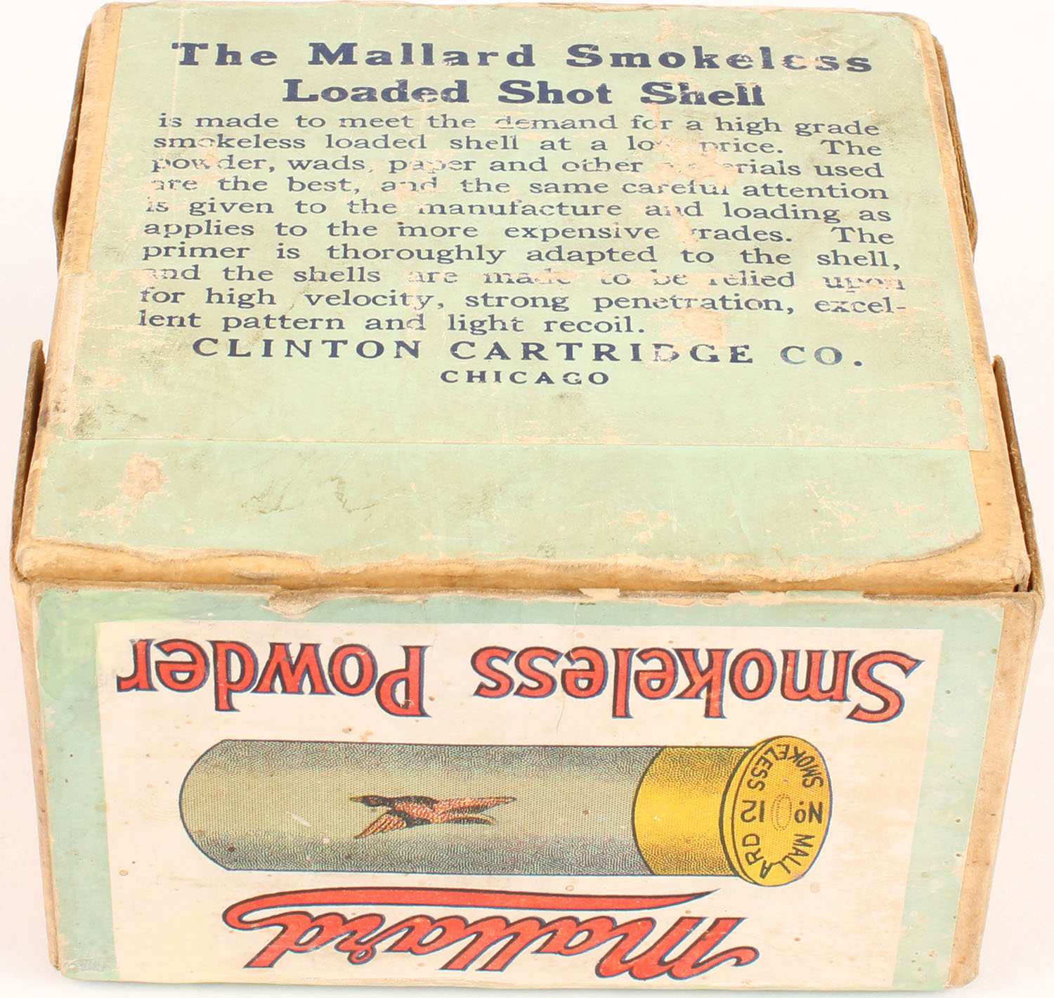 RARE! Clinton Cartridge Co., MALLARD, 12ga., 2pc., Empty, shot size 6 Shot, Loading 3 1/4 Drs. 1 1/8 oz. No. 6 Shot, buff box with multi colored label picturing a Mallard flying down, box has excellent colors with light age soiling & light scuffing, label is 100% ORIGINAL, VERY RARE BOX! * Grade: Excellent ++ - Value: 1500 to 4000