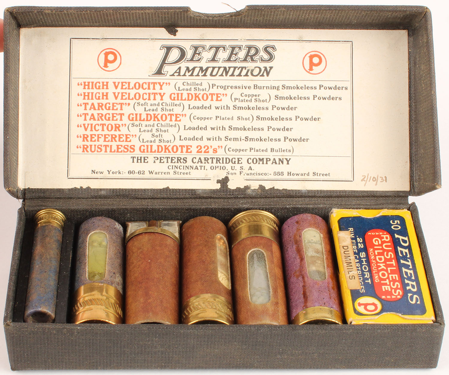 RARE! Peters Salesman Sample Kit has 4 Window Shells, .410 High Velocity shell, a cut away shell & .22 Short Rustless Gildkote Dummies box that is FULL with dummies!, shells are excellent, box is very solid. Grade: Excellent ++ - Value: 150 to 1000