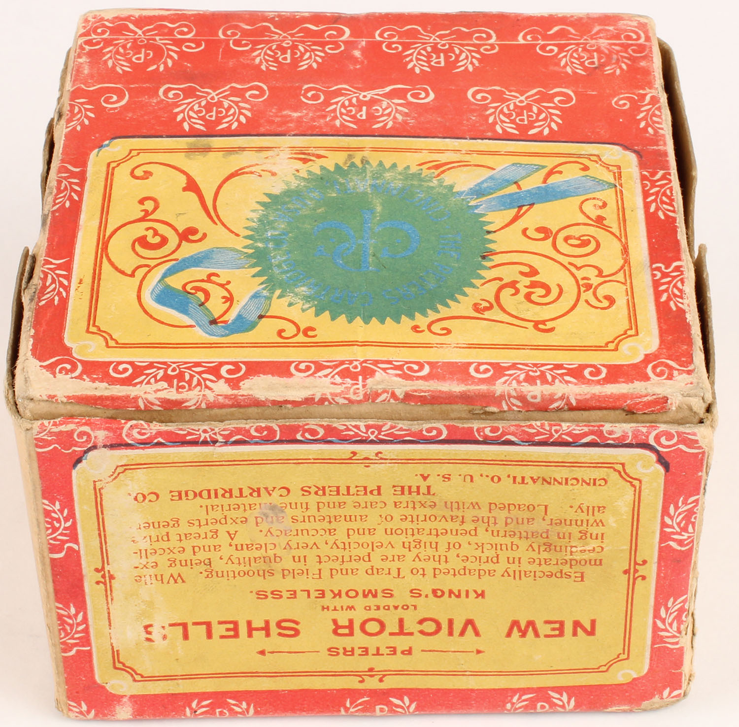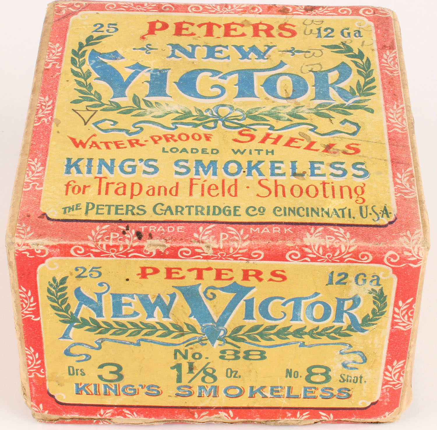Peters Cart. Co., New Victor, 12ga., 2pc., Partial 16rds of fired paper,, shot size 8, buff box with multi-colored label, Loading: No. 38, 3 Drs., 1 1/8 Oz. No. 8 Shot, King's Smokeless, box has great label with bottom label being correct & being 100% intact but has light soiling to label with tape repair and light edge wear, Shells are very good. Grade: Excellent ++ - Value: 1000 to 3000