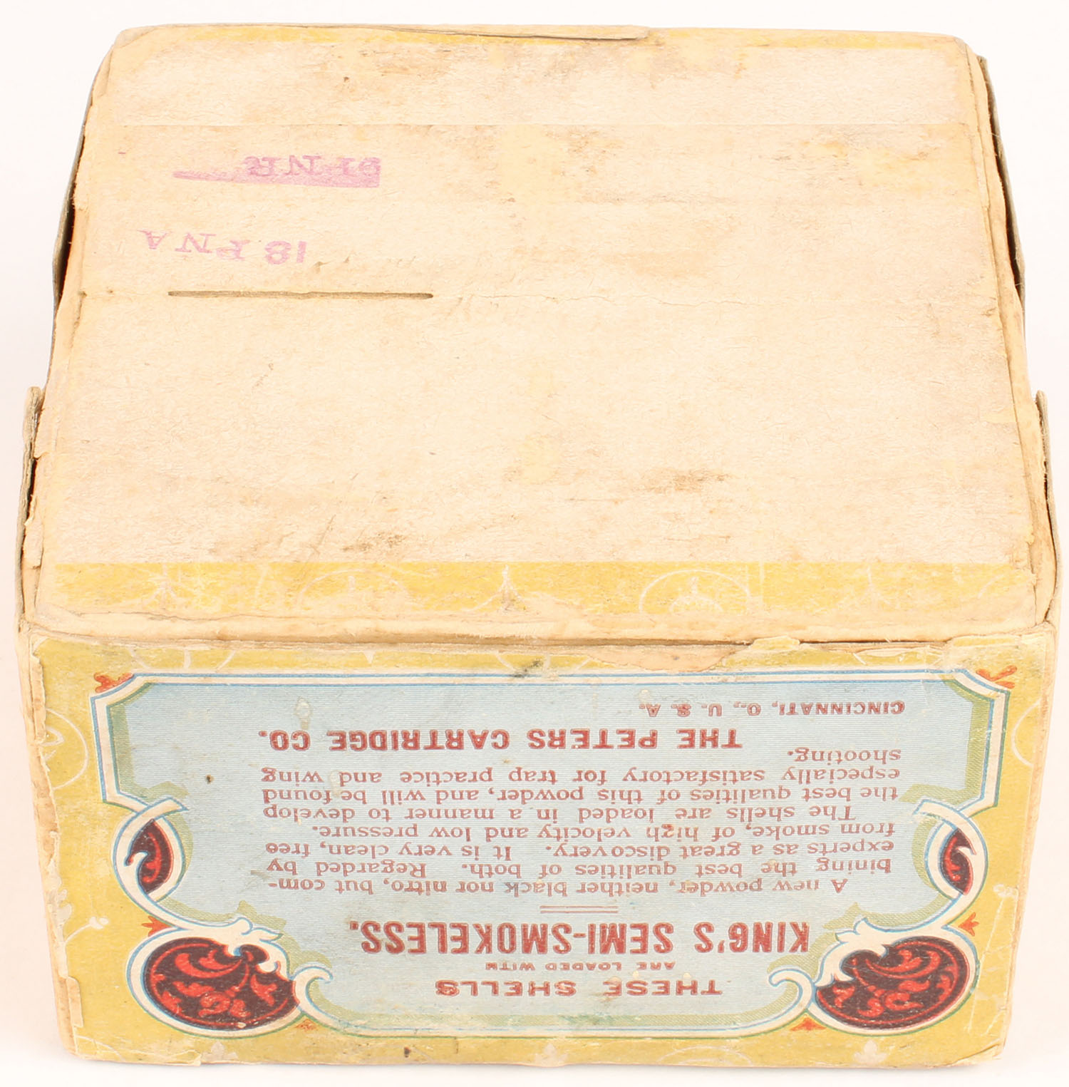 Peters Cart. Co., Referee without Mallard, 10ga., 2pc., Full of incorrect shot size, shot size 5, buff box with multi-colored label, Loading: No. B25, 3 1/2 Drs., 1 1/8 Oz. No. 5 Shot, Semi-Smokeless Powder, box has very nice label with bottom label being correct & being 95% intact but has soiling and light scuffing to label, box has tape repair, Shells are very good. Grade: Excellent + - Value: 600 to 1000