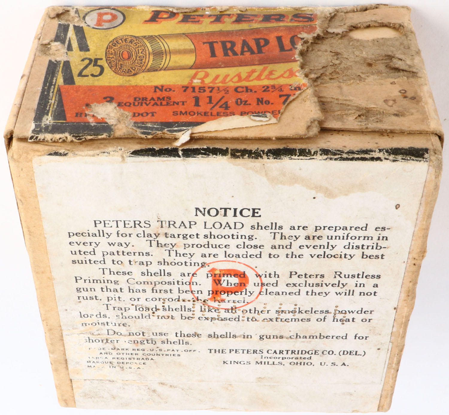 Peters Cart. Co., TRAP LOAD, 12ga., 2pc., Full of fired shotshells, ''HALLOWEEN BOX'' buff box with orange, yellow, white & black paper label, 7 1/2 Chilled Shot, 2 3/4'', box has soiling with major scuffing, edge wear & nice color to label, Shells are good. Grade: Very Good + - Value: 50 to 250