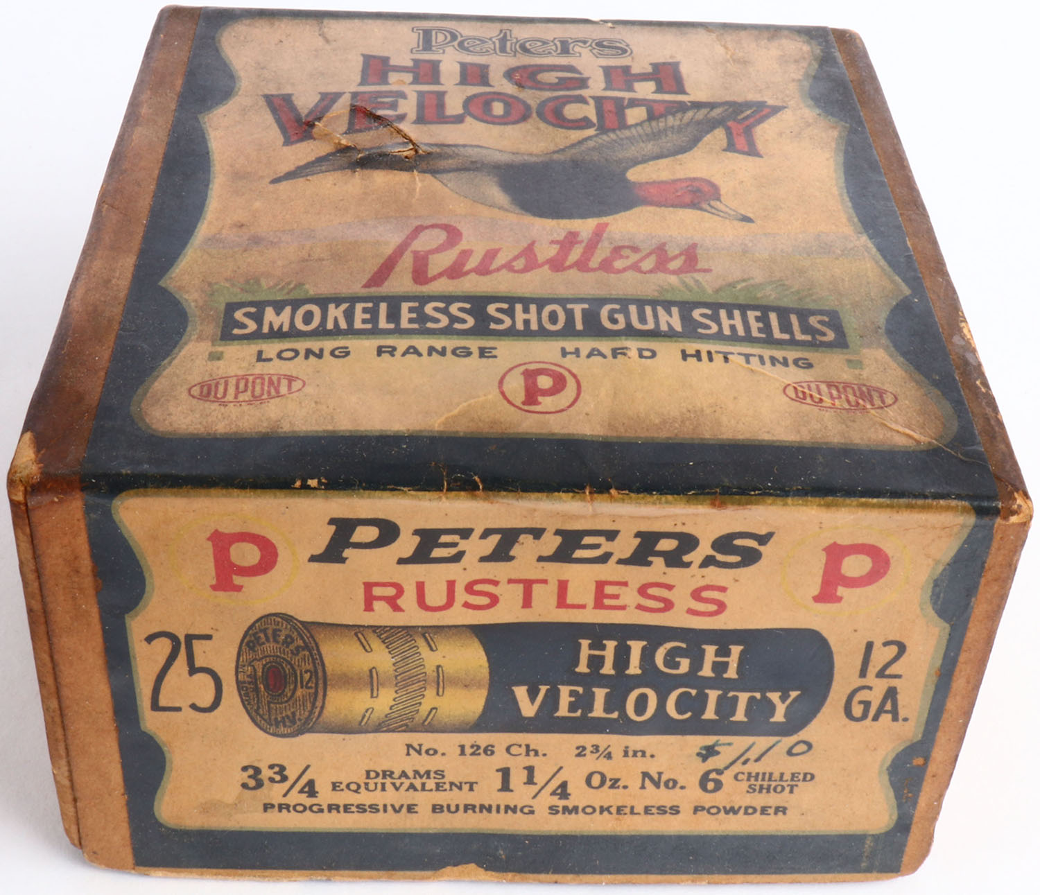 Peters Cart. Co., RED HEAD BOX, High Velocity, 12ga., 2pc., Empty, shot size 6 Chilled Shot, buff box with multi colored label that pictures RED HEAD in flight, 2 3/4'', Loading: NO 126 Ch. 3 3/4 drms. 1 1/4 oz. 6 Chilled Shot, box is solid, has age soiling and nice colored label. Grade: Good ++ - Value: 50 to 250