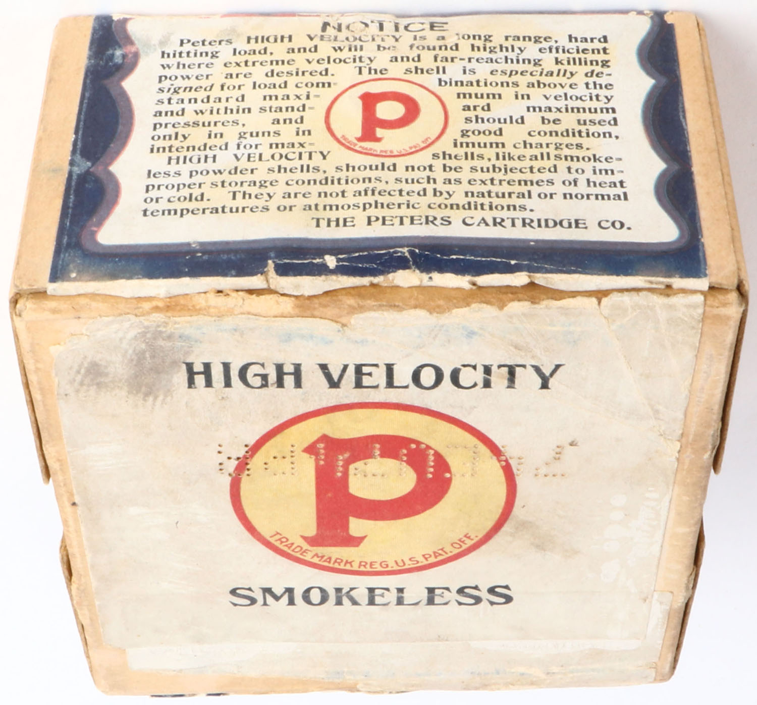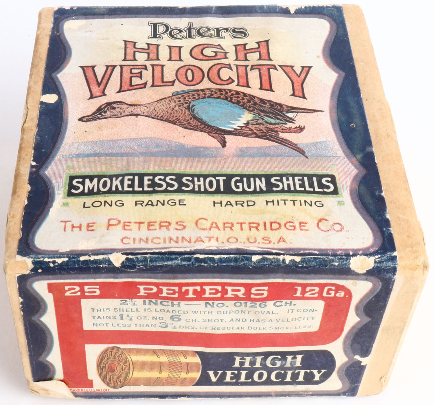 Peters Cart. Co., Blue Wing Teal, 12ga., 2 3/4'', 2pc., Empty, shot size 6 CH, buff box with multi colored label that pictures Blue Wing Teal in flight, box has light soiling, light scuffing & light edge wear with very nice colors. Grade: Excellent - Value: 200 to 500