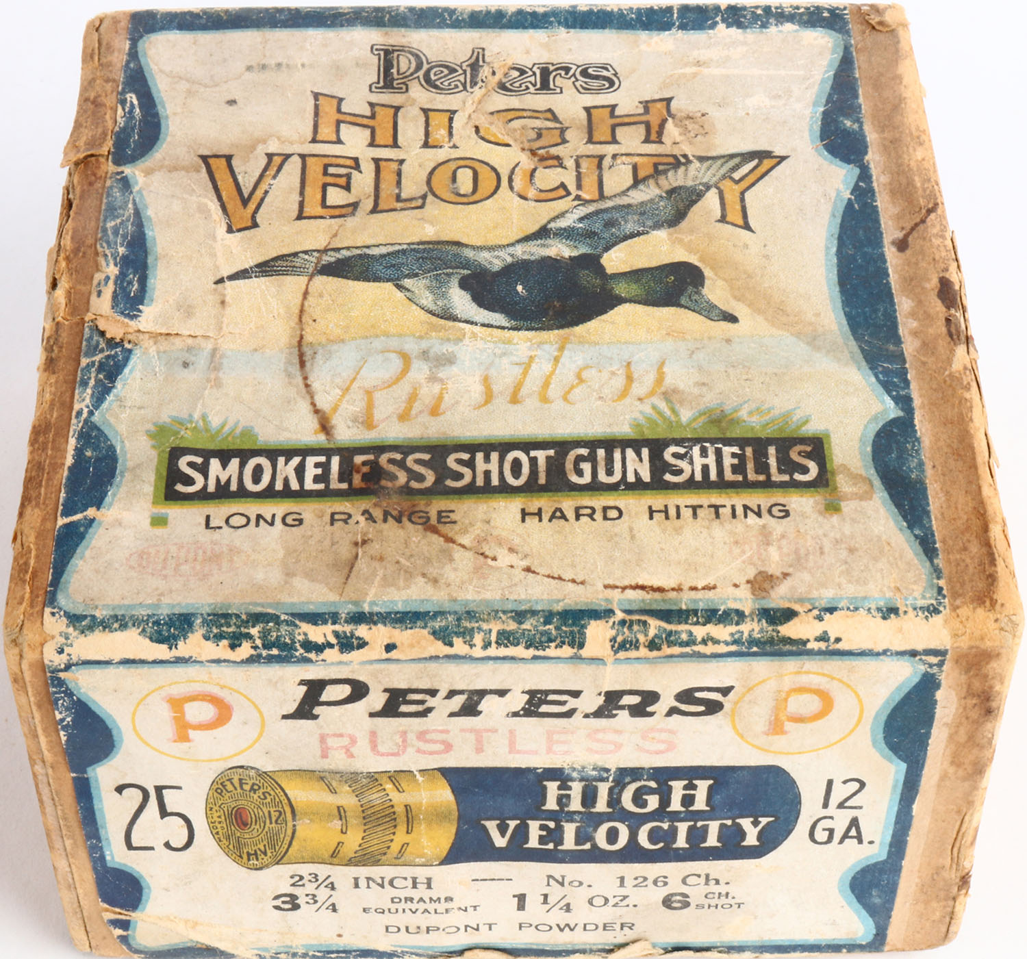 Peters Cart. Co., Blue Bill, 12ga., 2pc., Empty, shot size 6ch shot, buff box with multi colored label that pictures Blue Bill in flight, box is solid with age soiling, seam splits, edge wear, scuffing & tape repair with nice colors. Grade: Good ++ - Value: 50 to 300
