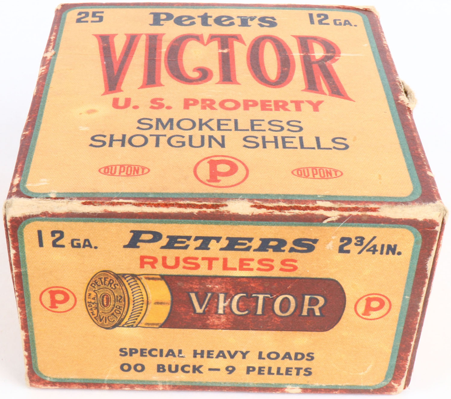 Peters, Victor, U.S. Property 12ga, 1pc., Full, shot size 00 Buck, Maroon, cream & orange box, 2 3/4'', box has light edge wear, shell protrusions & light soiling with great colors, Shells are excellent. Grade: Excellent - Value: 40 to 80