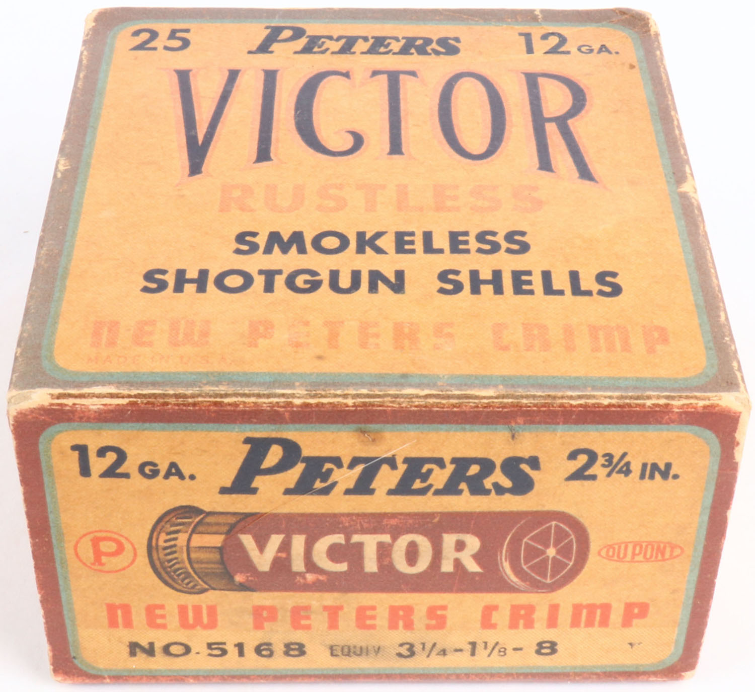 Peters, Victor, 12ga, 1pc., Empty, shot size 8, Maroon, cream & orange box, 2 3/4'', box has light edge wear & light soiling with some fading. Grade: Very Good ++ - Value: 20 to 40