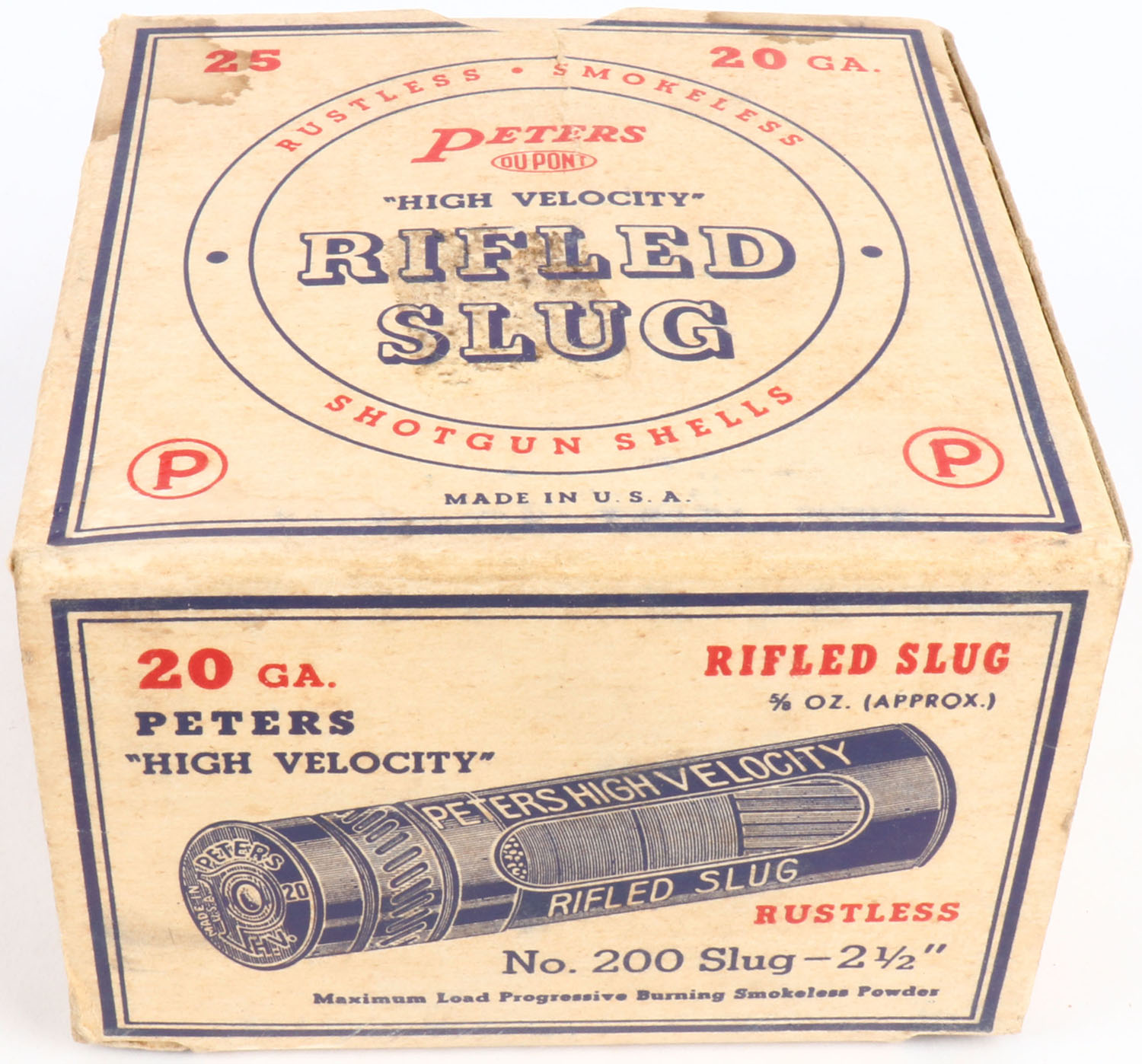 Peters Cart. Co., RIFLED SLUGS, 20 GAUGE, 2 3/4'', 1pc., Partial 9rds with 5rds being correct gauge, shot size Rifled Slug, multi colored box, box is very solid with great colors, box has soiling, Shells are excellent. Grade: Excellent - Value: 20 to 60