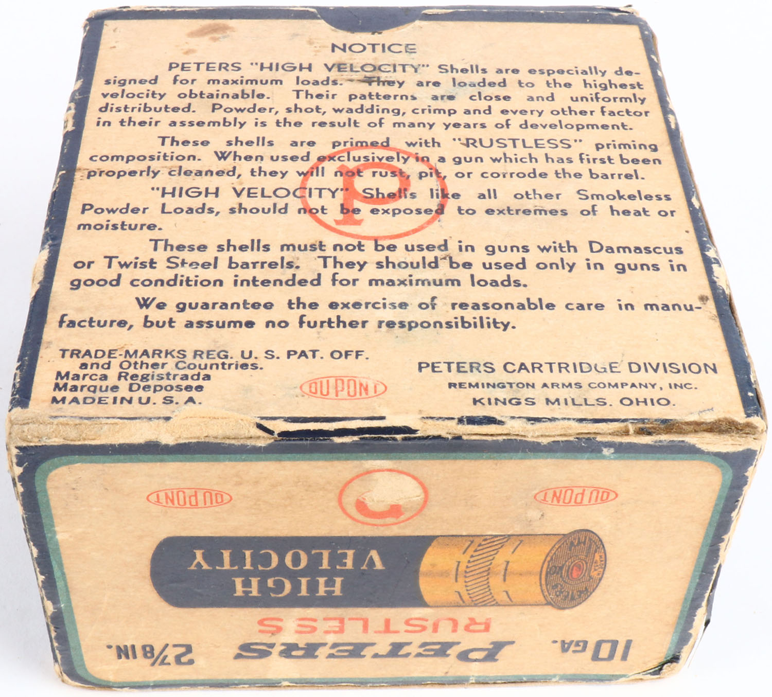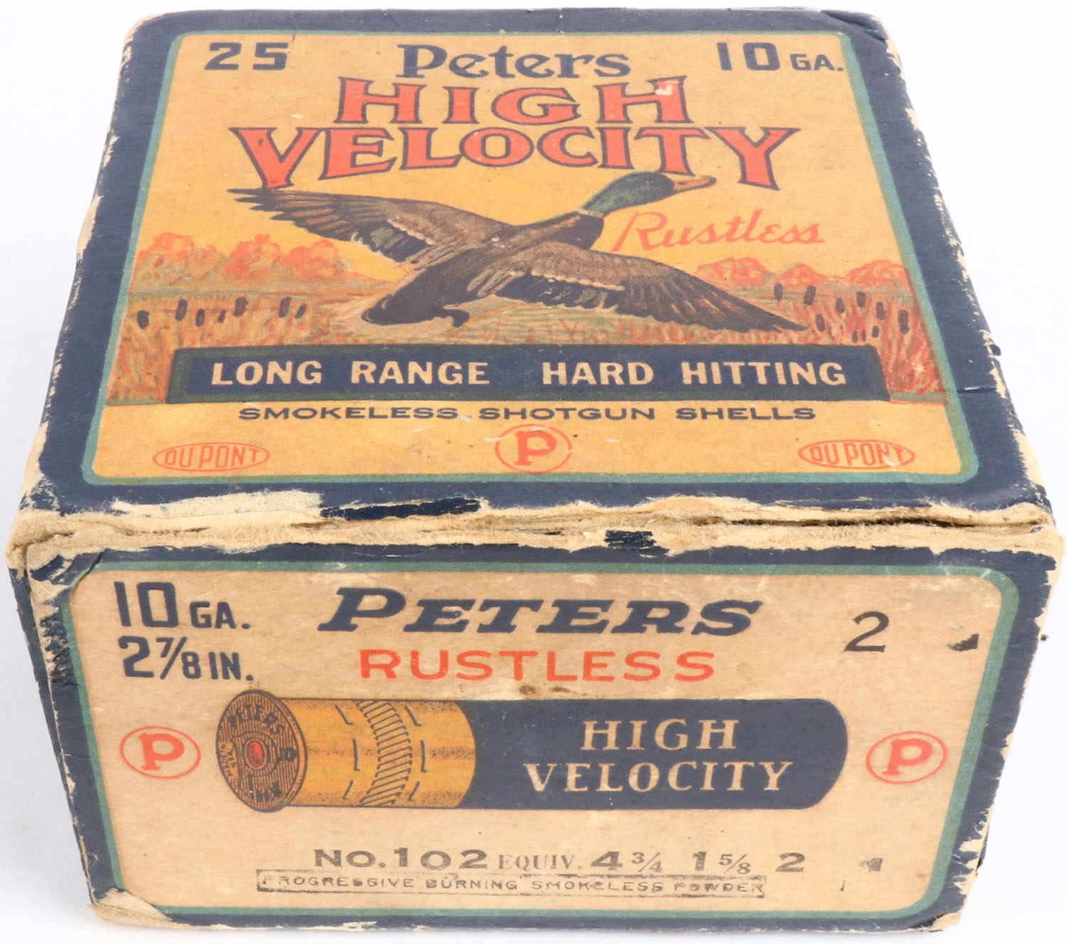 Peters Cart. Co., Kings Mills, OH, High Velocity, 10ga., 1pc., Full, shot size 2, multi colored box that pictures mallard flying out of the marsh grass, box has edge wear, light scuffing and both top and bottom flaps and torn, box has very nice colors, shells are excellent. Grade: Excellent - Value: 40 to 120