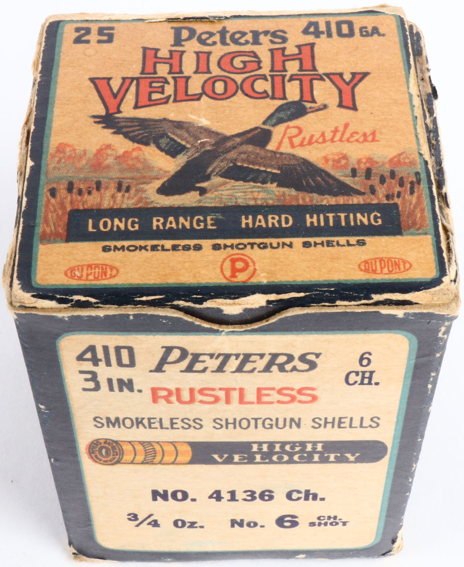 rare Peters, High Velocity, 410ga., 3'', 1pc., Full with only 11rds being correct shot size, shot size 6 CH, multi-colored box with mallard duck flying out of marsh grass, box has great colors with edge wear, Shells are excellent. Grade: Excellent - Value: 40 to 100