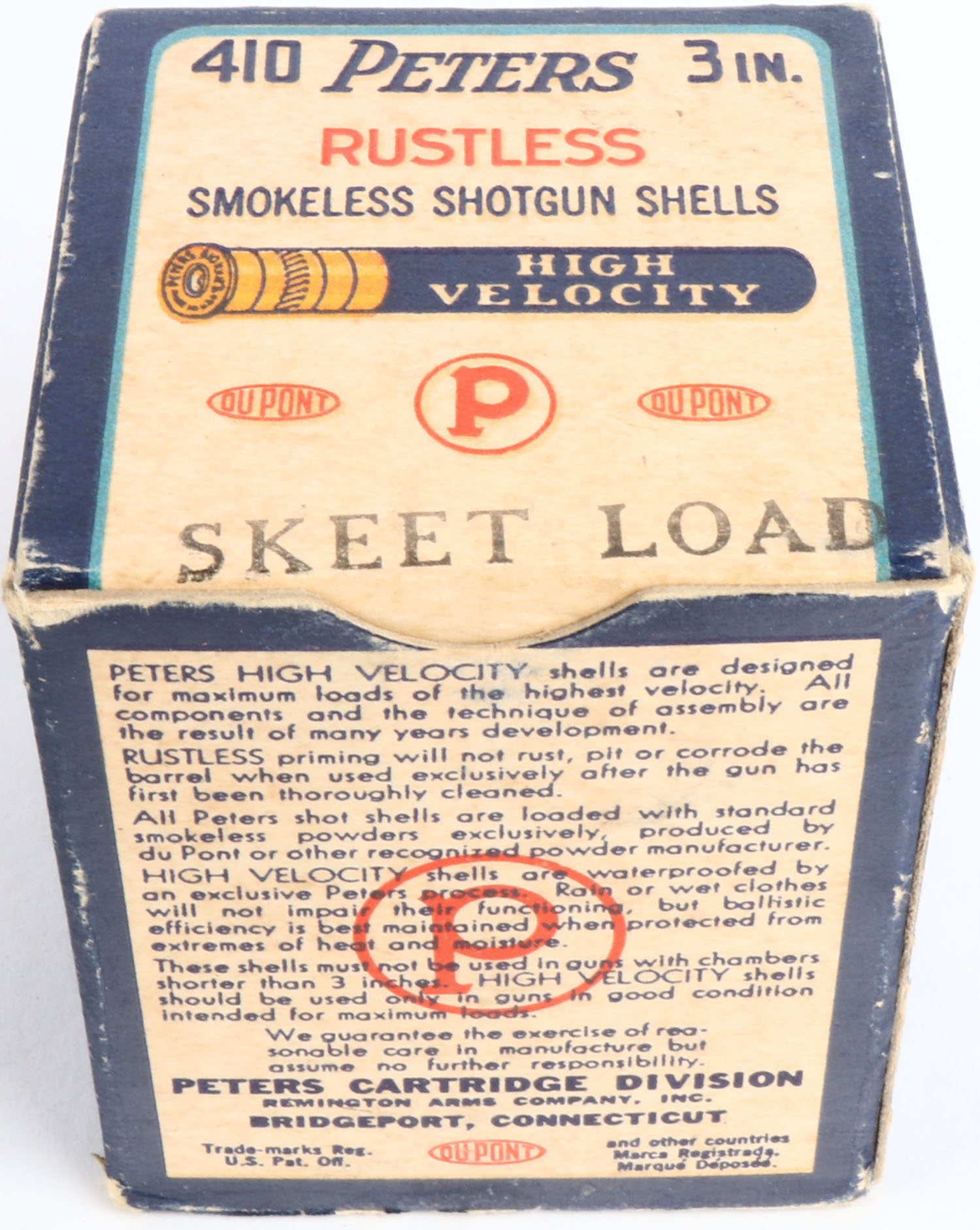 Peters, High Velocity, 410ga., 3'', 1pc., Full of mostly 6 shot and other mixed shot sizes., shot size Skeet Load, multi-colored box with mallard duck flying out of marsh grass, box has great colors with light edge wear, Shells are excellent. Grade: Excellent + - Value: 40 to 100