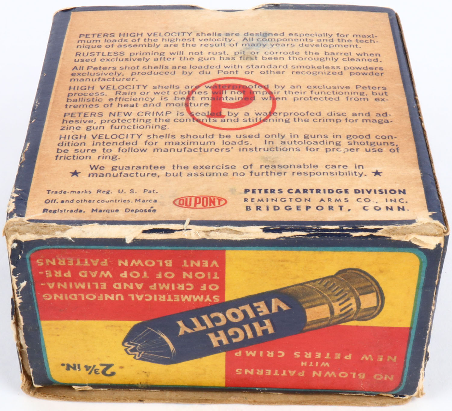 Peters Cart. Co., High Velocity, New Peters Crimp, 12ga., 1pc., Empty, shot size 7 1/2, multi colored box that pictures mallard flying out of the marsh grass, box is solid with edge wear, scuffing & light age soiling. Grade: Very Good ++ - Value: 10 to 60