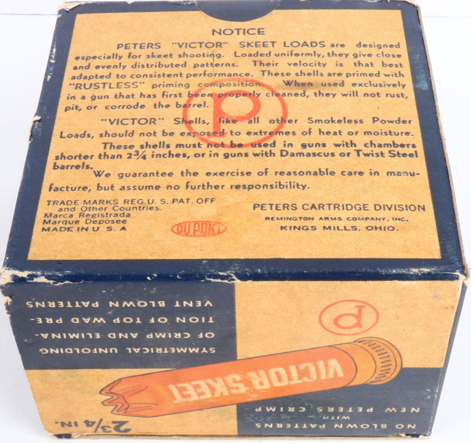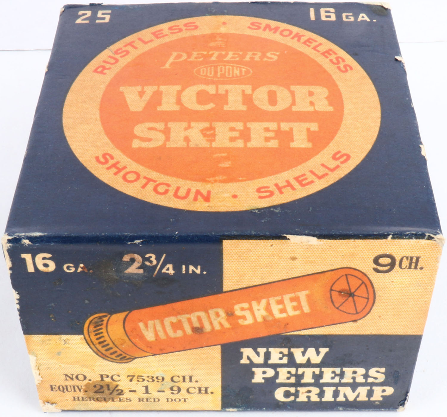 Peters, VICTOR SKEET, 16ga., 1pc., Full, shot size 9 CH, blue, white & orange box, box has very nice color with light edge wear & light soiling, shells are excellent. Grade: Excellent - Value: 10 to 40