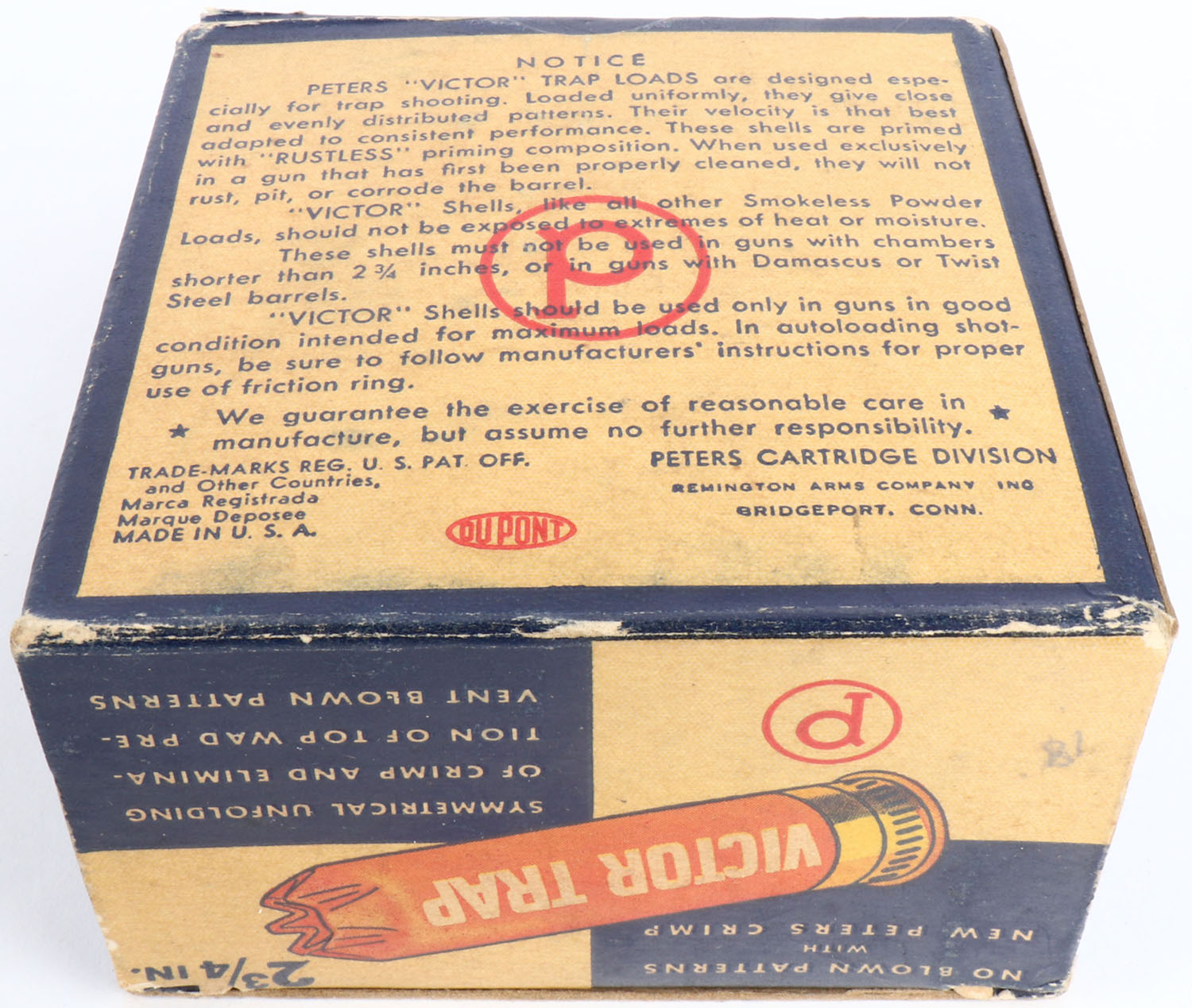Peters, VICTOR TRAP, 12ga., 1pc., Partial 18rds, might possibly be reloads, shot size 7 1/2, blue, white & orange box, box has very nice color with soiling, shells are very good. Grade: Very Good ++ - Value: 10 to 40