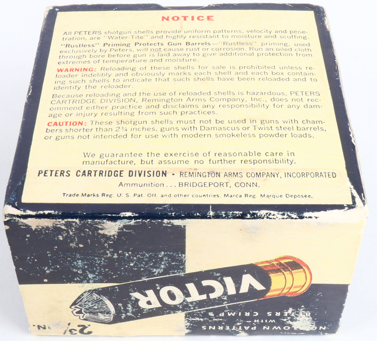 Peters, VICTOR, 12ga., 1pc., Full, shot size 7 1/2, blue, white & red box, box has great color with light edge wear & light scuffing, shells are excellent. Grade: Excellent - Value: 10 to 40
