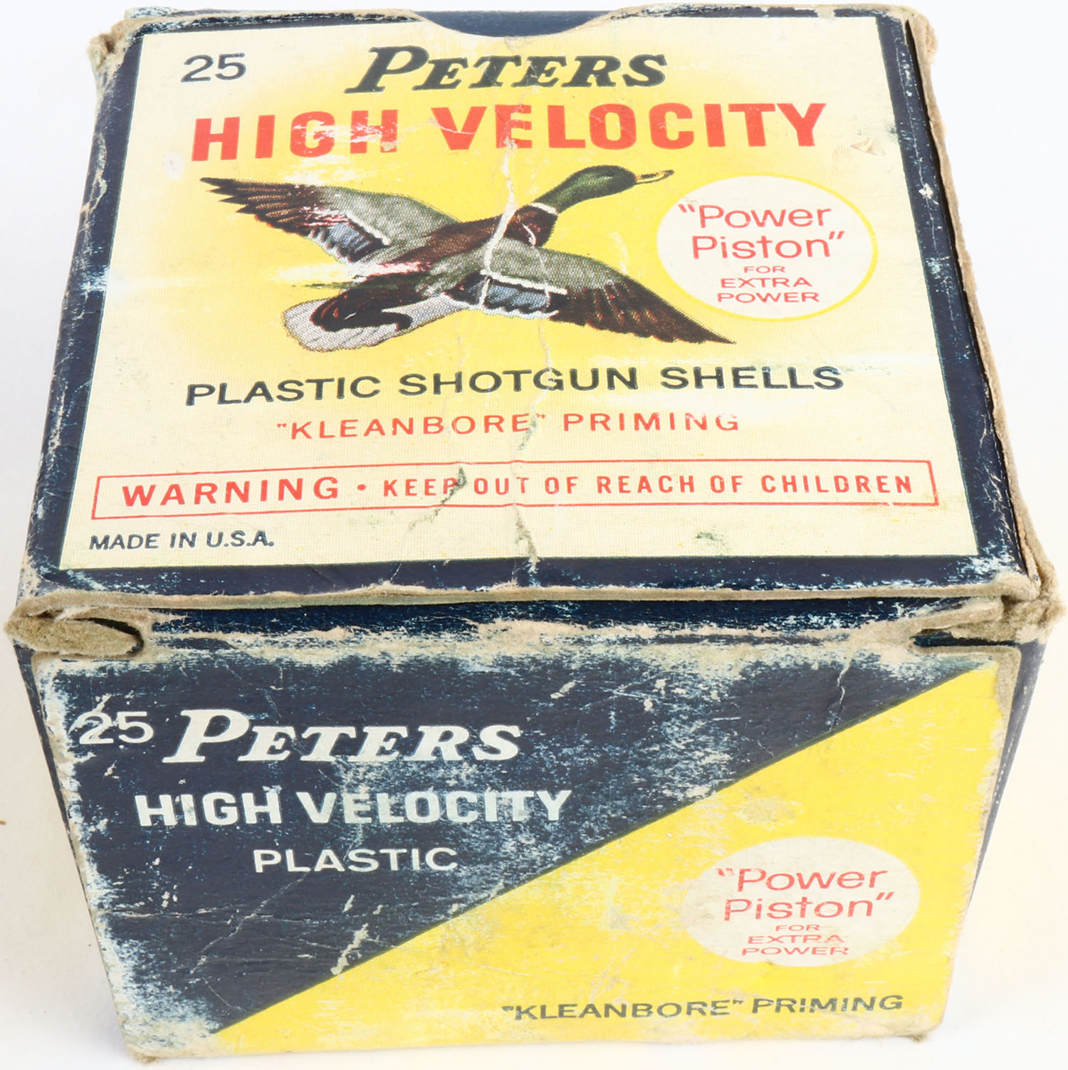 Peters Cart. Co., High Velocity, 28ga, 2 3/4'', 1pc., Partial 24rds with only 7rds being correct, shot size 7 1/2, multi colored box that pictures mallard flying, box is solid with edge wear, scuffing, soiling & very nice color, shells are good. Grade: Very Good + - Value: 8 to 30