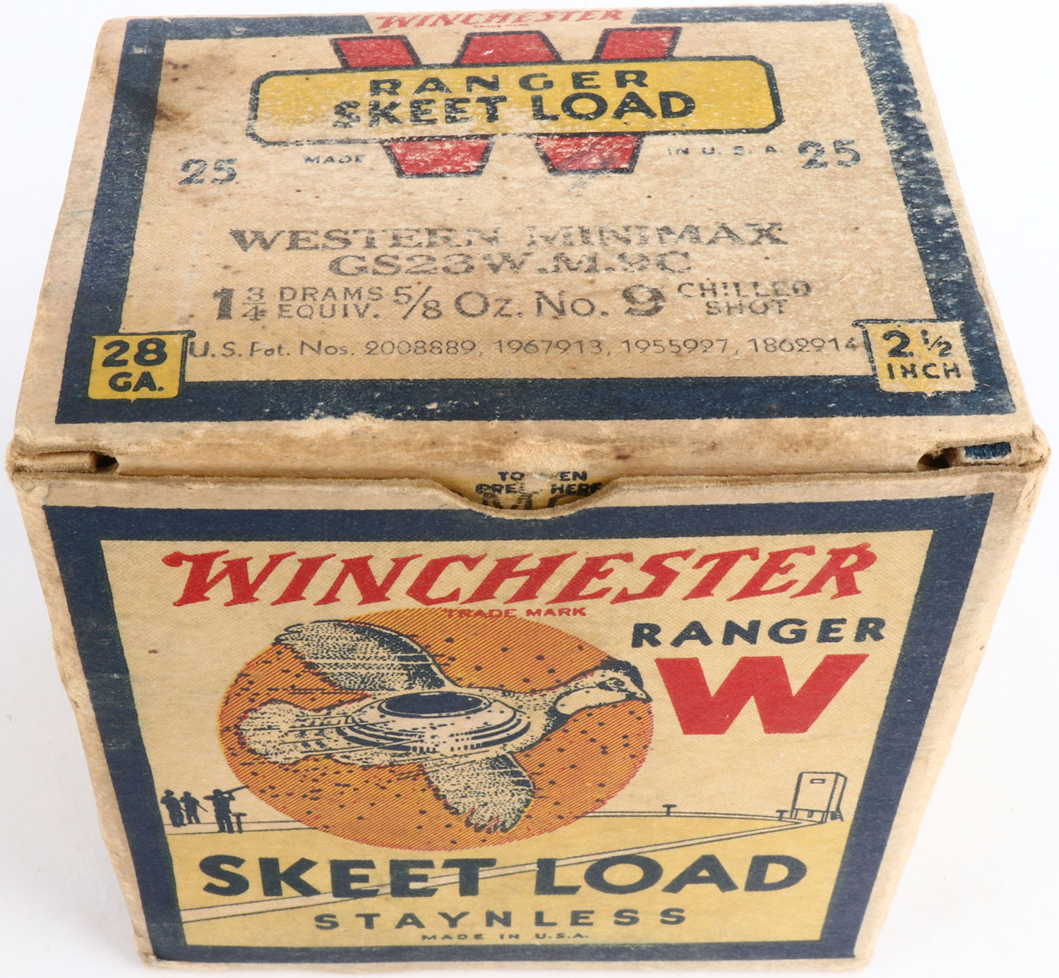 Winchester, RANGER SKEET LOAD, 28ga, 1pc., Full, White, black & red box that pictures flying Quail with skeet in body & shot all around, Western Minimax Staynless, 2 1/2'', Loading: 1 3/4 Drams 5/8 Oz. 9 Chilled Shot, Box is very solid with light soiling, light scuffing & excellent colors, Shells are good. RARE BOX. Grade: Very Good ++ - Value: 200 to 600