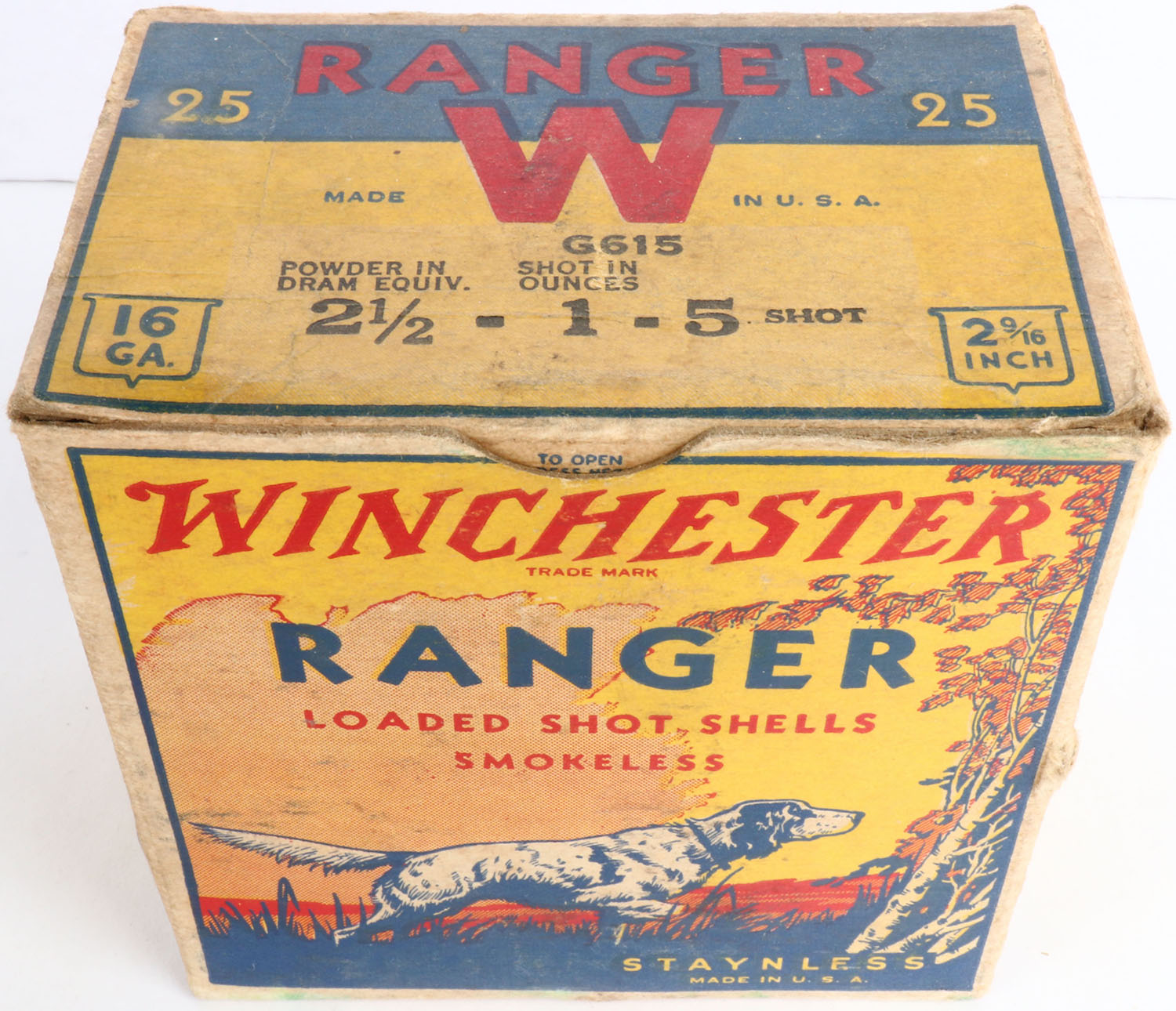 Winchester, Ranger, 16ga, 1pc., Full, shot size 5, multi colored box, dog on point, shells 2 9/16'', box is solid with light age soiling, shell protrusion & great colors, shells are very good. Grade: Excellent - Value: 20 to 80