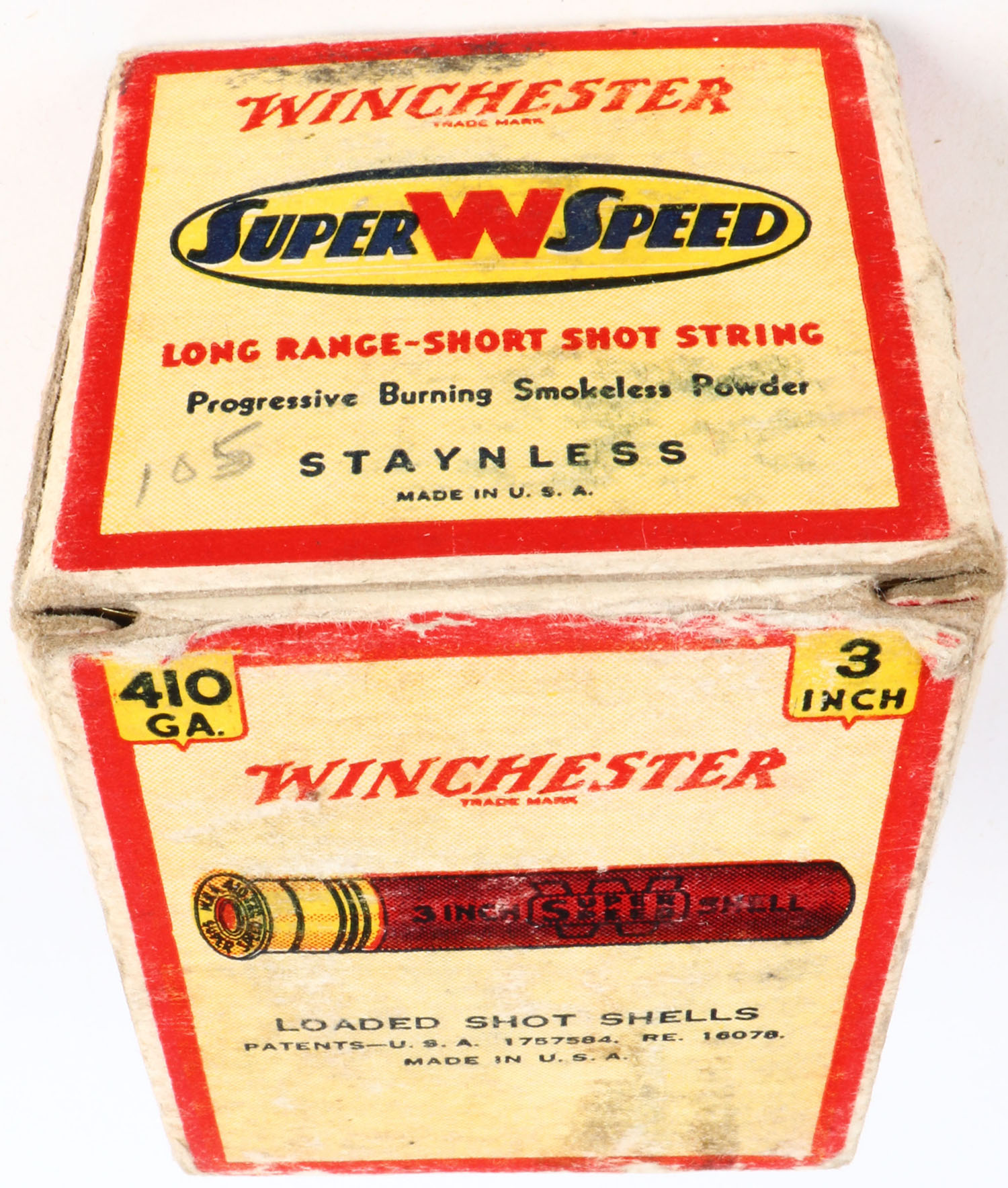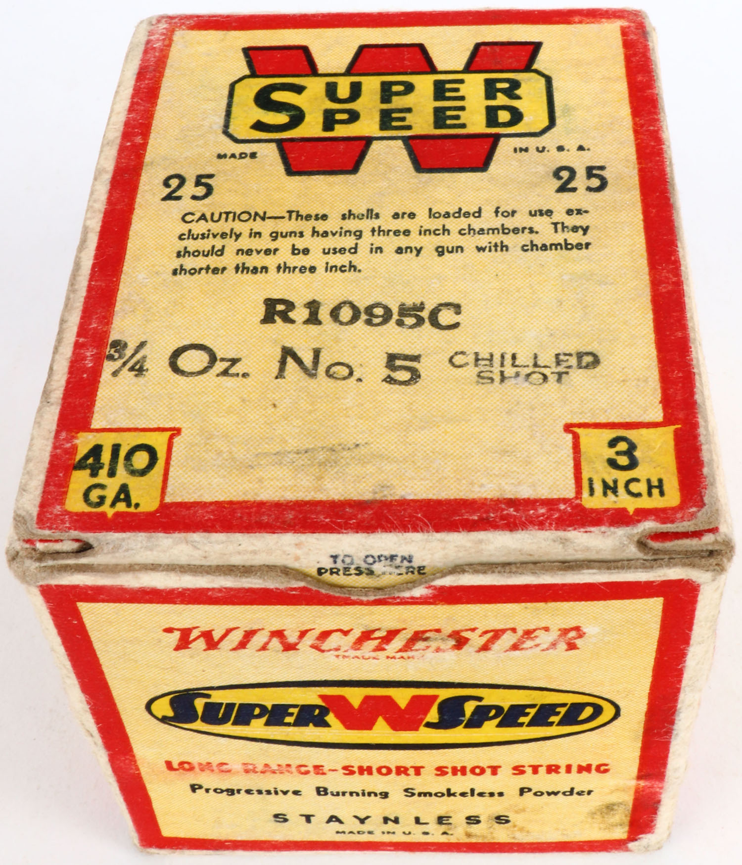 Winchester, Super W Speed, 410ga., Staynless, 3'', 1pc., Full, shot size 5 Chilled, cream, red, blue and yellow box, box is solid with great colors, box shows light soiling with light scuffing, shells are excellent. Grade: Excellent - Value: 16 to 40