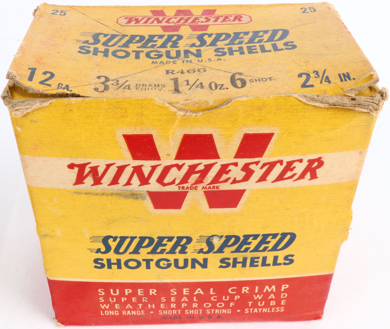 Winchester, Super Speed, 12ga., 1pc., Partial 12rds with two rounds being slightly different looking, 2 3/4'', shot size 6, red, yellow & blue box, box has light soiling, light edge wear with very nice colors, shells are excellent. Grade: Very Good ++ - Value: 8 to 30
