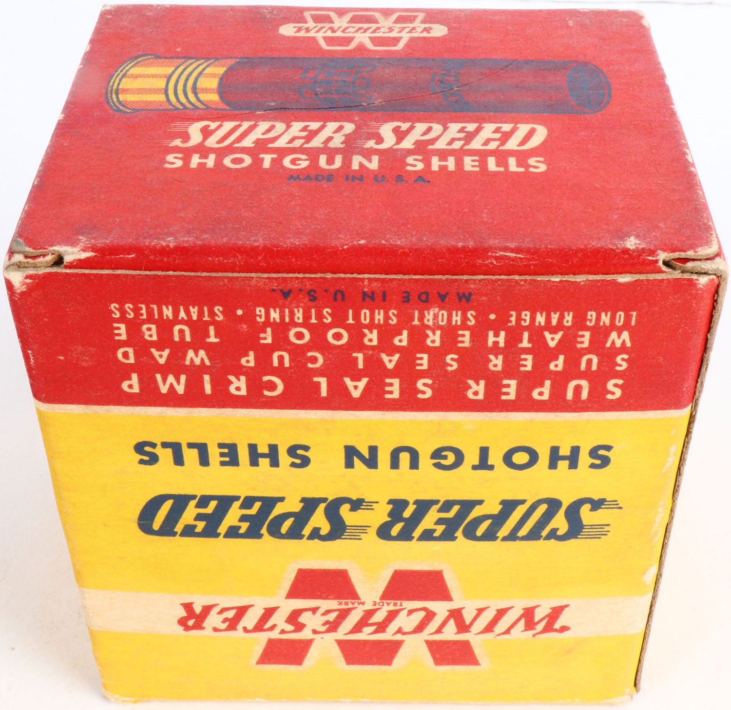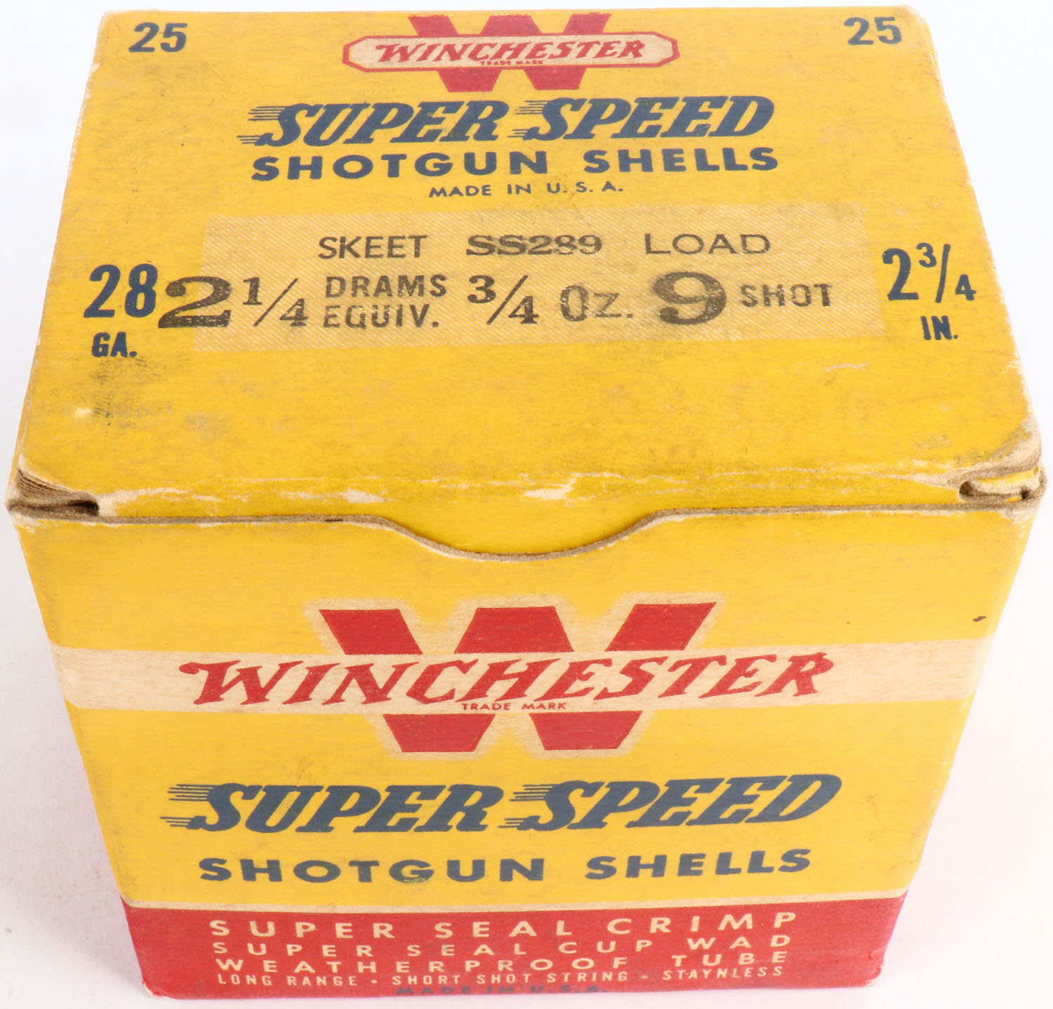 Winchester, Super Speed, 28ga., 1pc., Partial 23rds, 2 3/4'', shot size 9, red, yellow & blue box, box has light soiling with very nice colors. Grade: Excellent - Value: 10 to 30