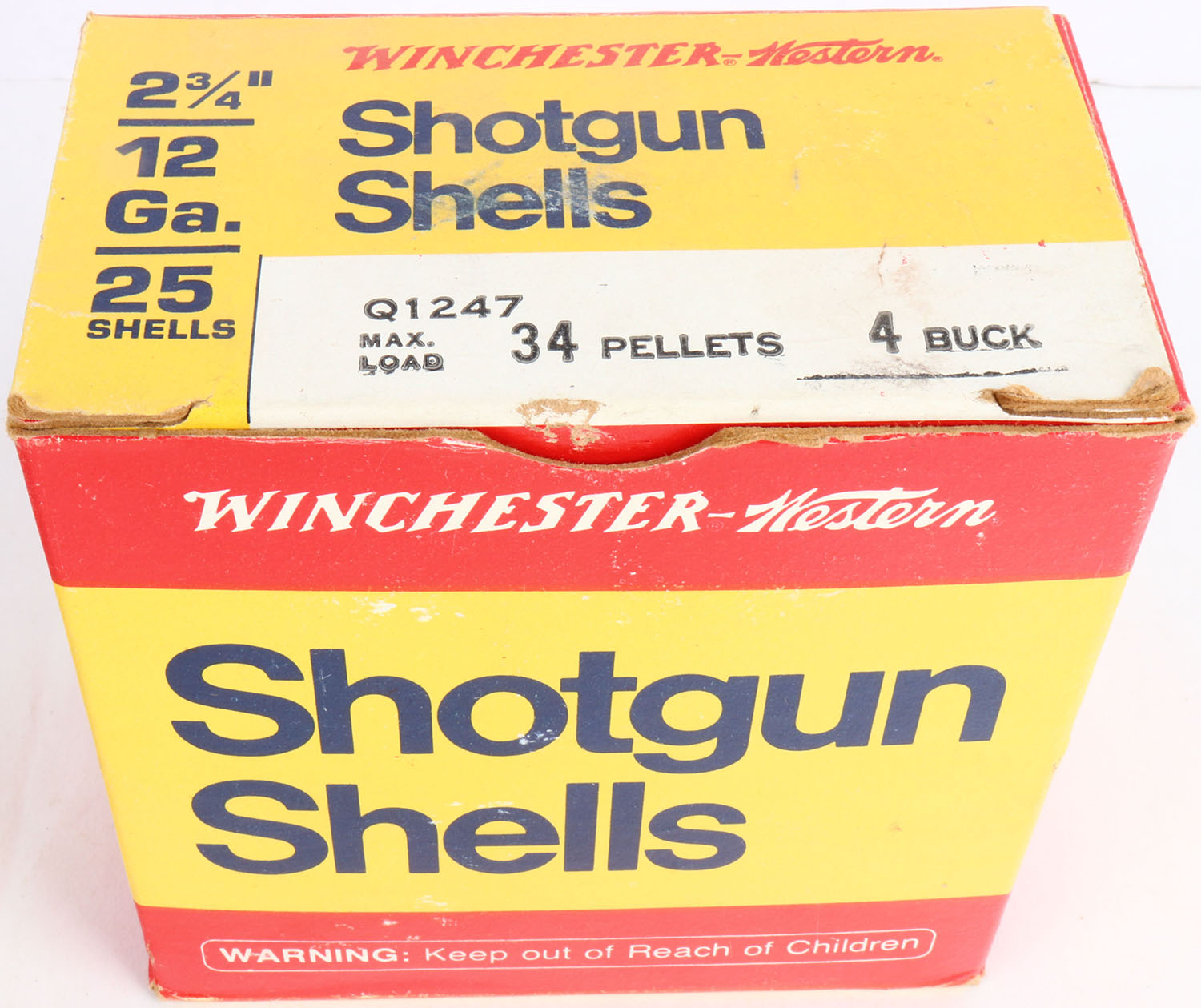 Winchester-Western, 12ga., 2 3/4'', 1pc., Full, shot size 4 Buckshot, box is very solid with light scuffing & very nice color, shells are excellent. Grade: Excellent + - Value: 10 to 30