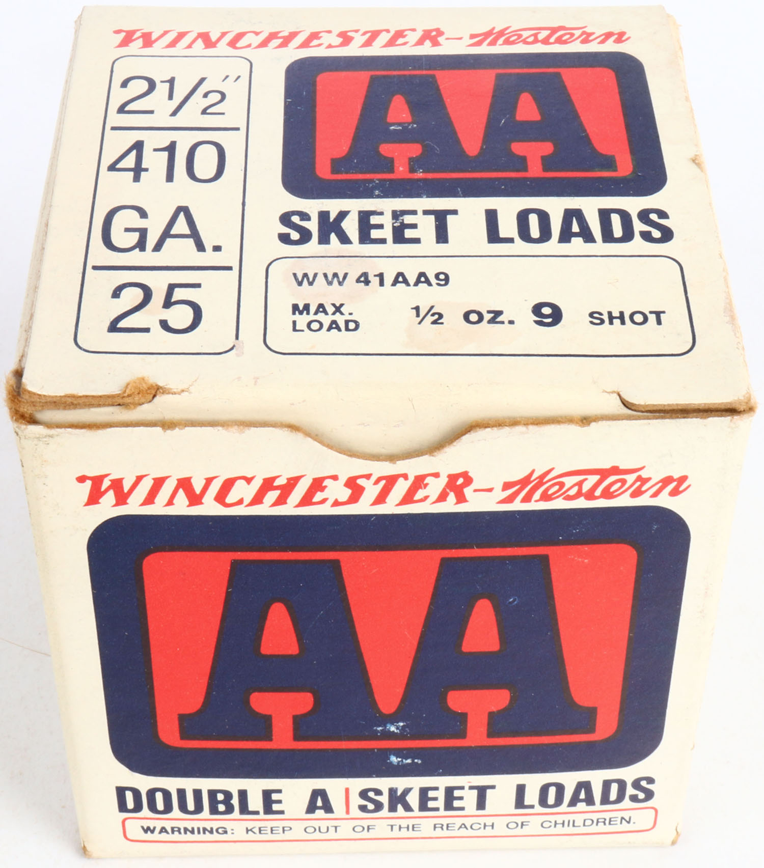 Winchester-Western, Double A Skeet Loads, 410ga, 1pc., Full with only 5rds being correct AA, multi-colored box, shot size 9, box is solid with very nice colors, Shells are excellent. Grade: Excellent - Value: 10 to 30
